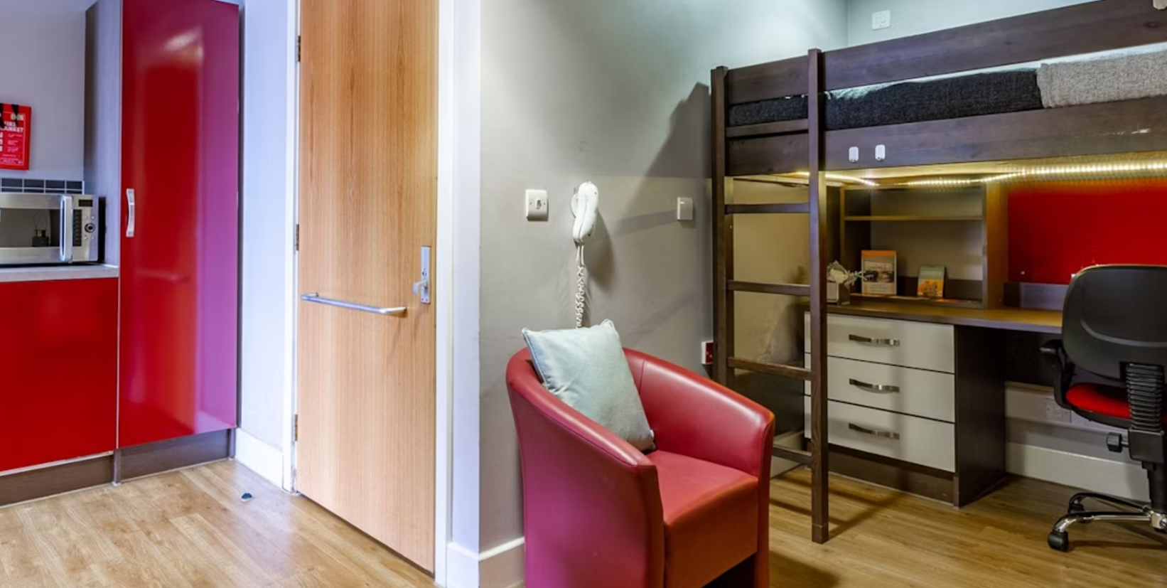 房间内配备书桌椅、餐桌椅、镜子、衣柜和充足的储物空间。私人厨房配备炉灶、烤箱、微波炉、冰箱和灶台。