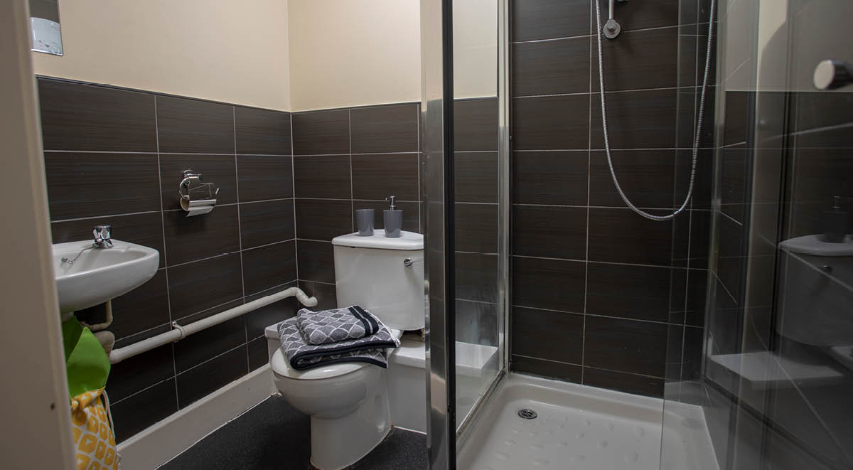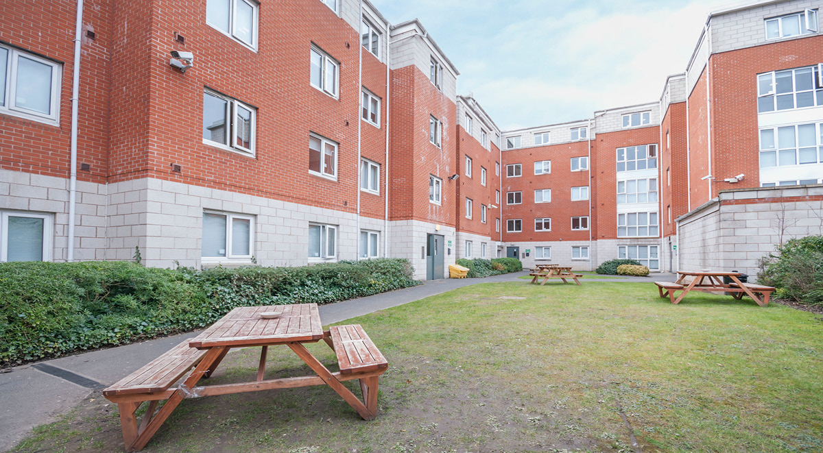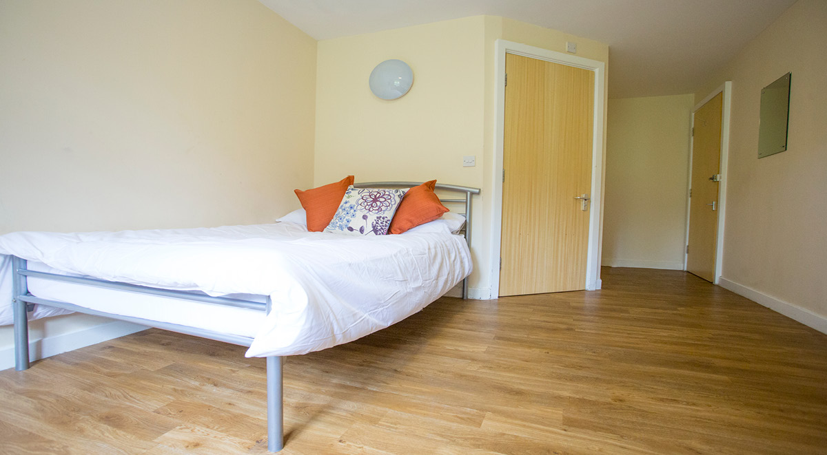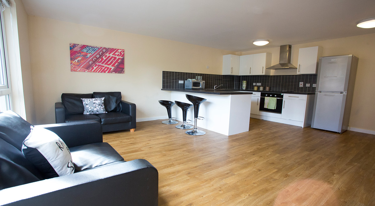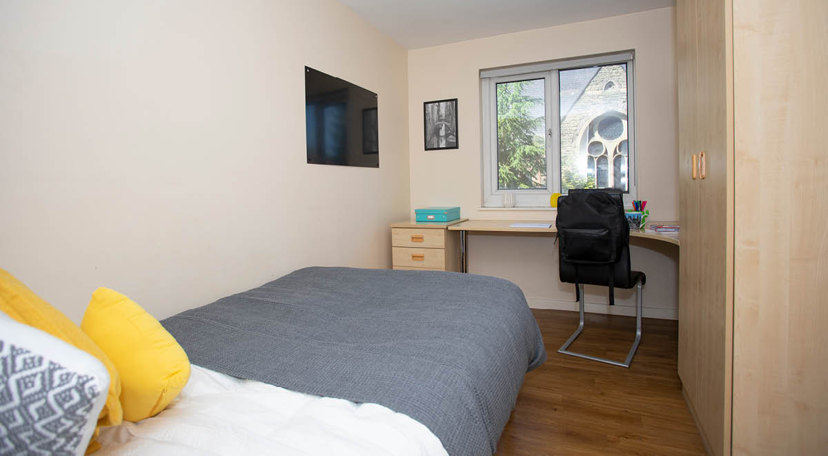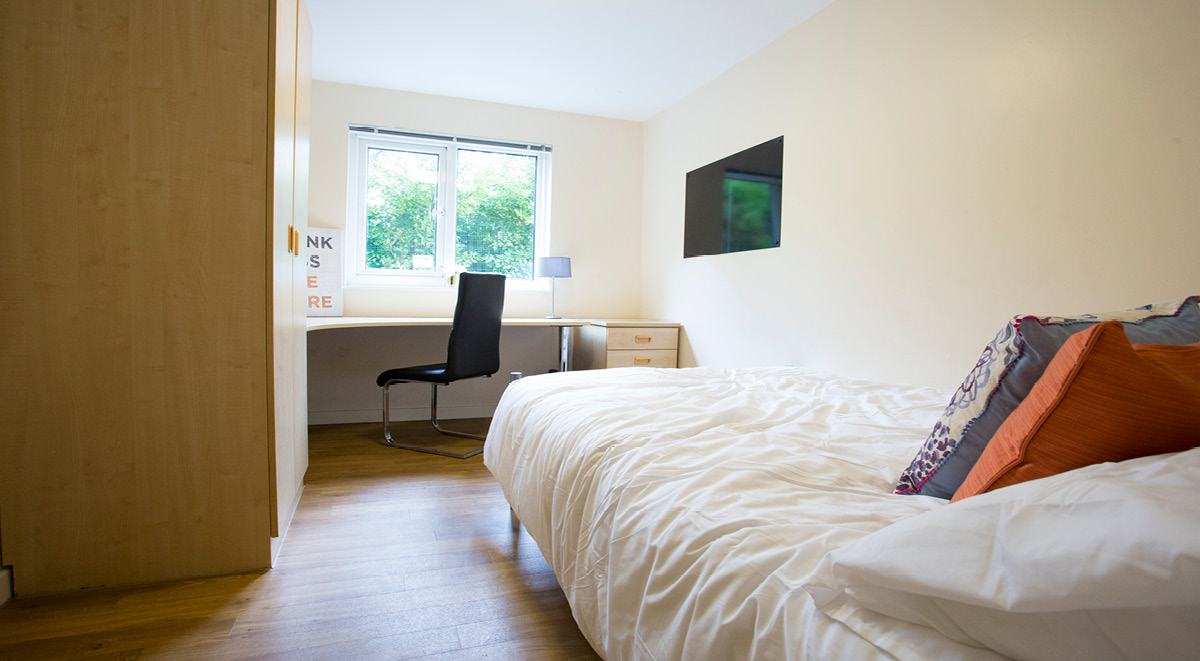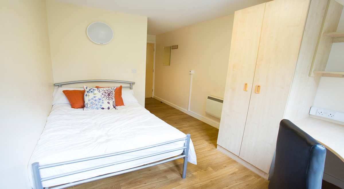 公寓全部为 en-suite 户型,每间配备私人卫浴、小双人床、学习桌椅、书架与独立储物空间。Flat 为 4–6 人共享厨房,厨房配置烤箱、灶台、冰箱冷冻、储物柜与用餐区,适合做饭与社交。高速网络覆盖房间与公共区域,日常学习与视频会议都够稳。