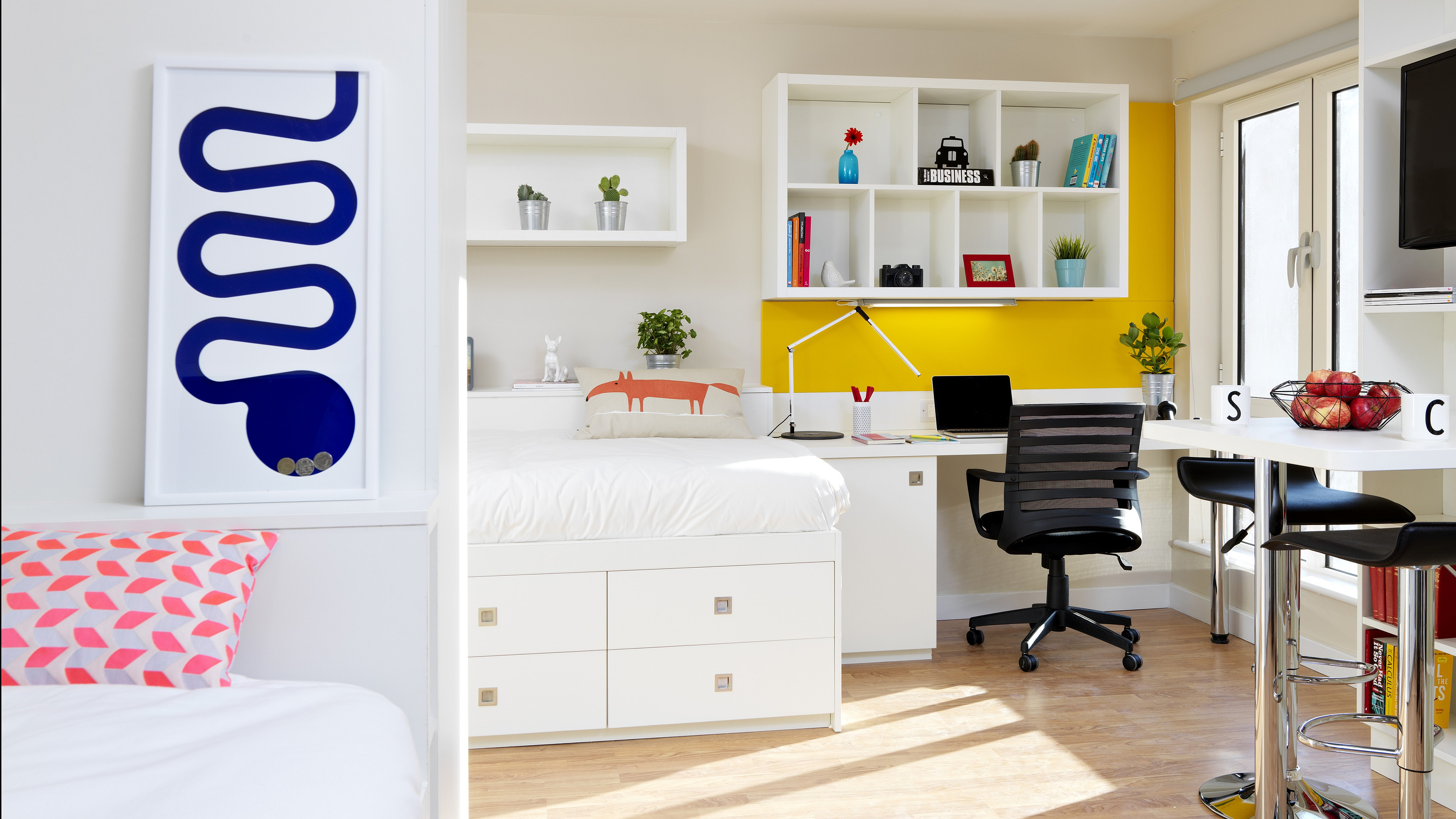 房间配备床、衣柜、书桌椅和储物空间,部分房型带独立卫浴或套间,满足不同隐私需求。共享厨房设备齐全,包括炉灶、烤箱、冰箱和基本厨具,适合自炊或与室友共同生活。公寓提供公共学习区、休息区与社交空间,便于学习与社交互动。高速网络覆盖每个房间,公共洗衣房与自行车存放设施齐全,为日常生活提供便利。