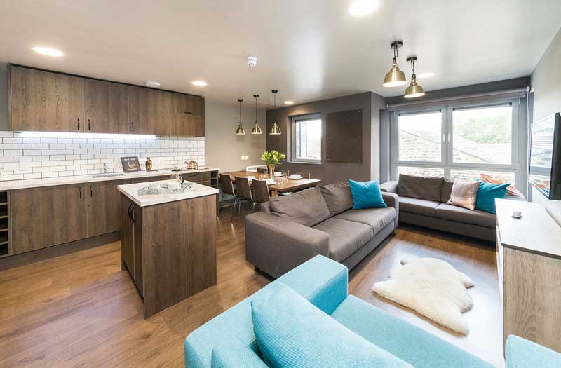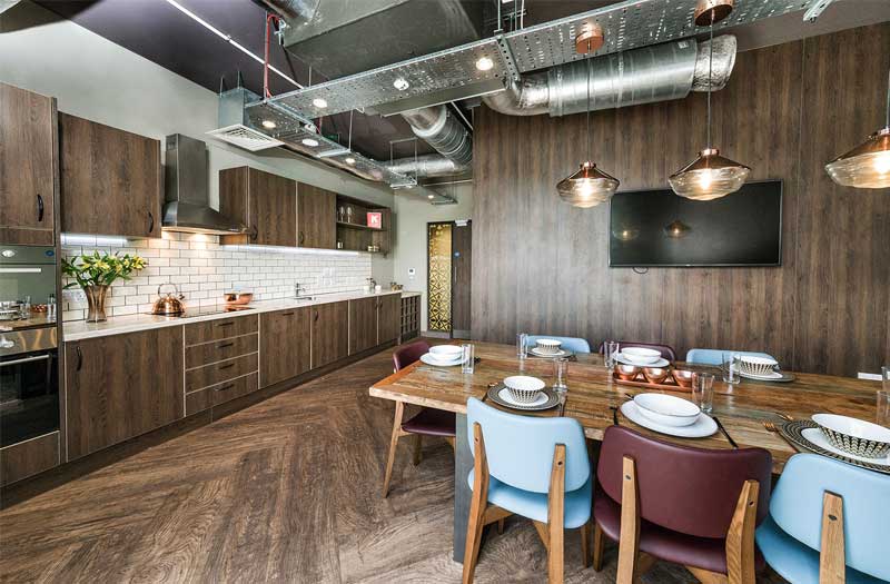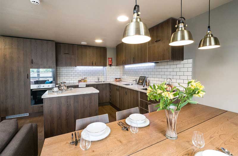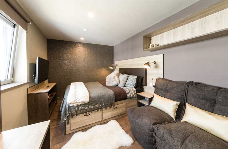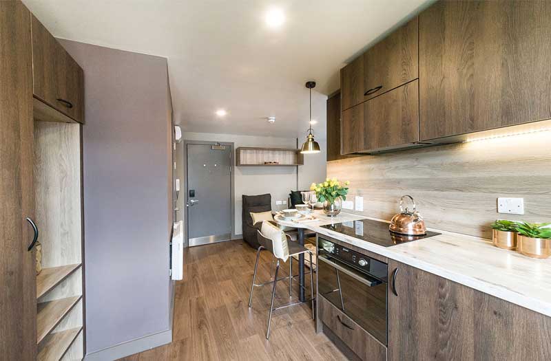 公寓提供 Ensuite和Stuio房型。ensuite 房型独立卫浴、共用厨房, 一般是5-6人间,是喜欢社交的学生的最佳选择;Studio房型独立卫浴、独立厨房,为学生提供更私密和自在的个人空间。公寓房间都是大落地窗,视野采光都很好。房间配有双人床、书桌椅、衣柜、穿衣镜等,有充足的储物空间。厨房配有灶台、冰箱、烤箱等。