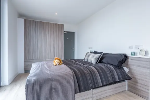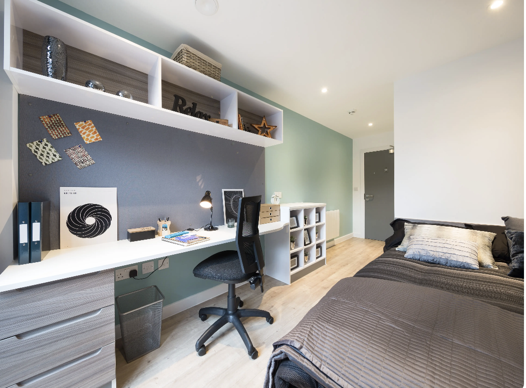 Studio为独立套房,带独立厨卫,适合注重独处空间的同学。每间均配全套家具舒适双人床、宽幅学习书桌、大容量衣柜,收纳充足不杂乱。