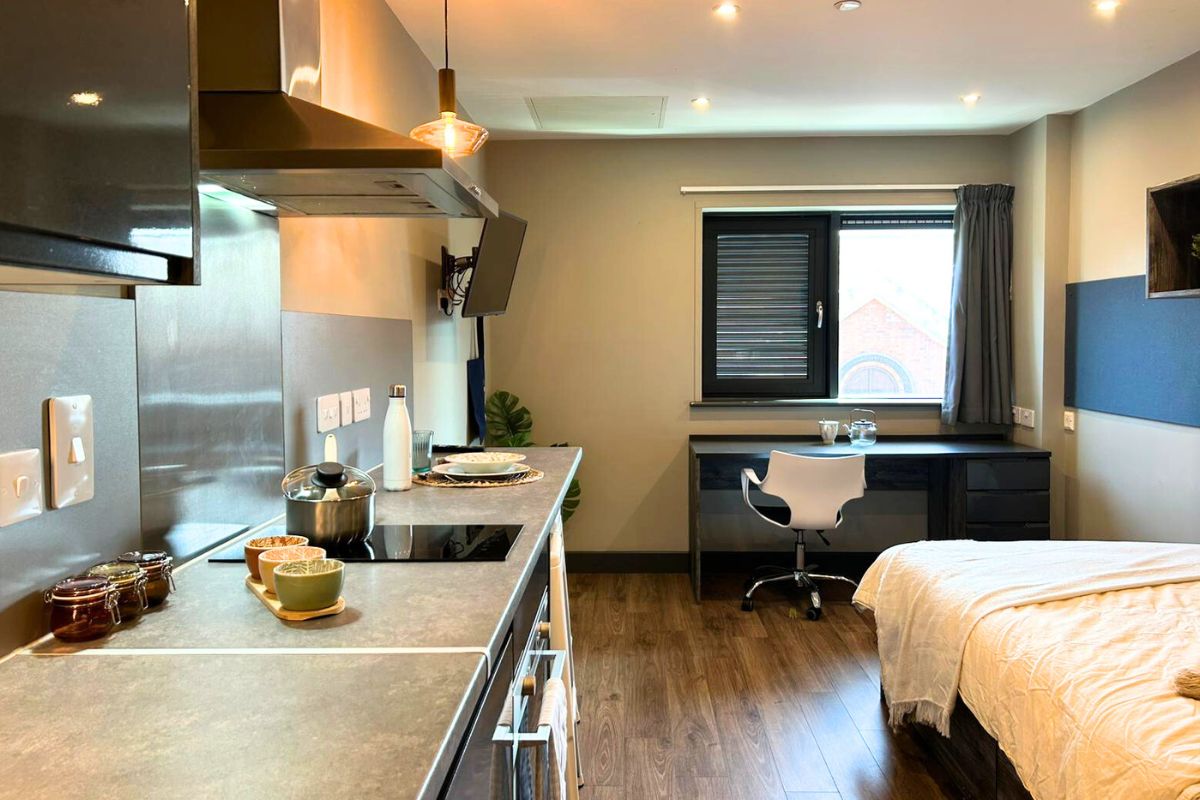 提供En-suite、Studio及Apartment三种房型,配备舒适双人床、定制衣柜及独立书桌。共享厨房含灶台/烤箱/冰箱,私人厨房增设微波炉,全景窗增强空间感。