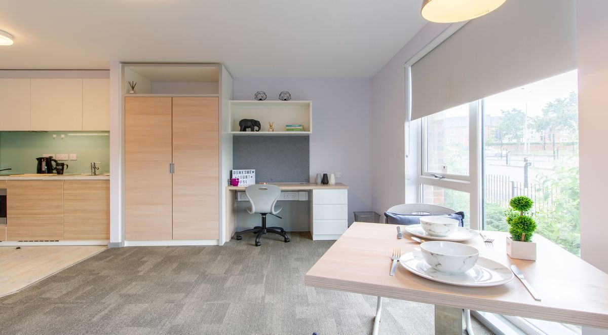 房间内部以 Studio 户型为主,满足单人或同行学子的居住需求,每户均配备独立卫浴与独立厨房,保障私密空间与生活自主性。房间内全套家具齐全,无需额外购置,厨房配备基础厨具,可随时施展厨艺。房间采光通透,暖气供应充足,搭配免费高速 WiFi 与有线电视,学习娱乐两不误。
