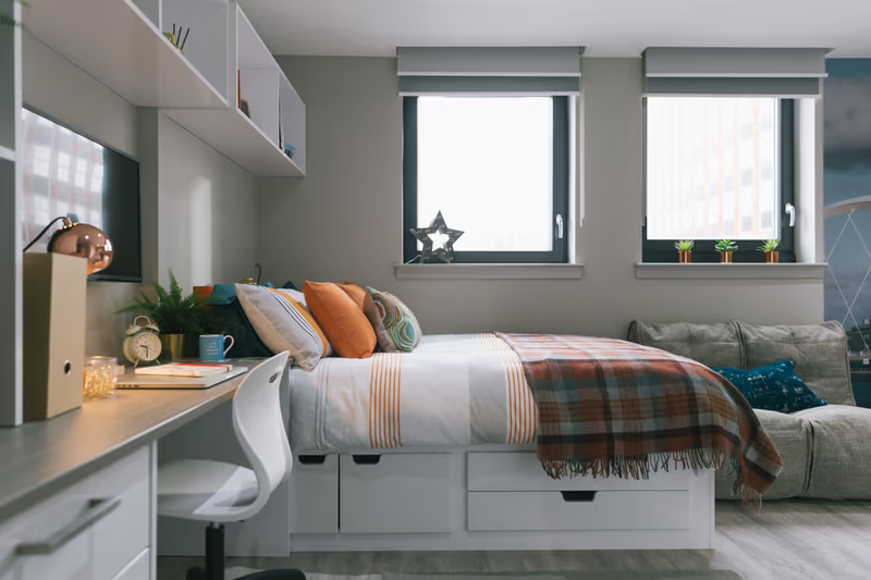 George Street Apartments步行15分钟直达格拉斯哥三大名校,Studio房型配备独立厨房。24小时安保+全包账单,健身房自习室齐全,博物馆就在家门口,留学生活安心又便利。