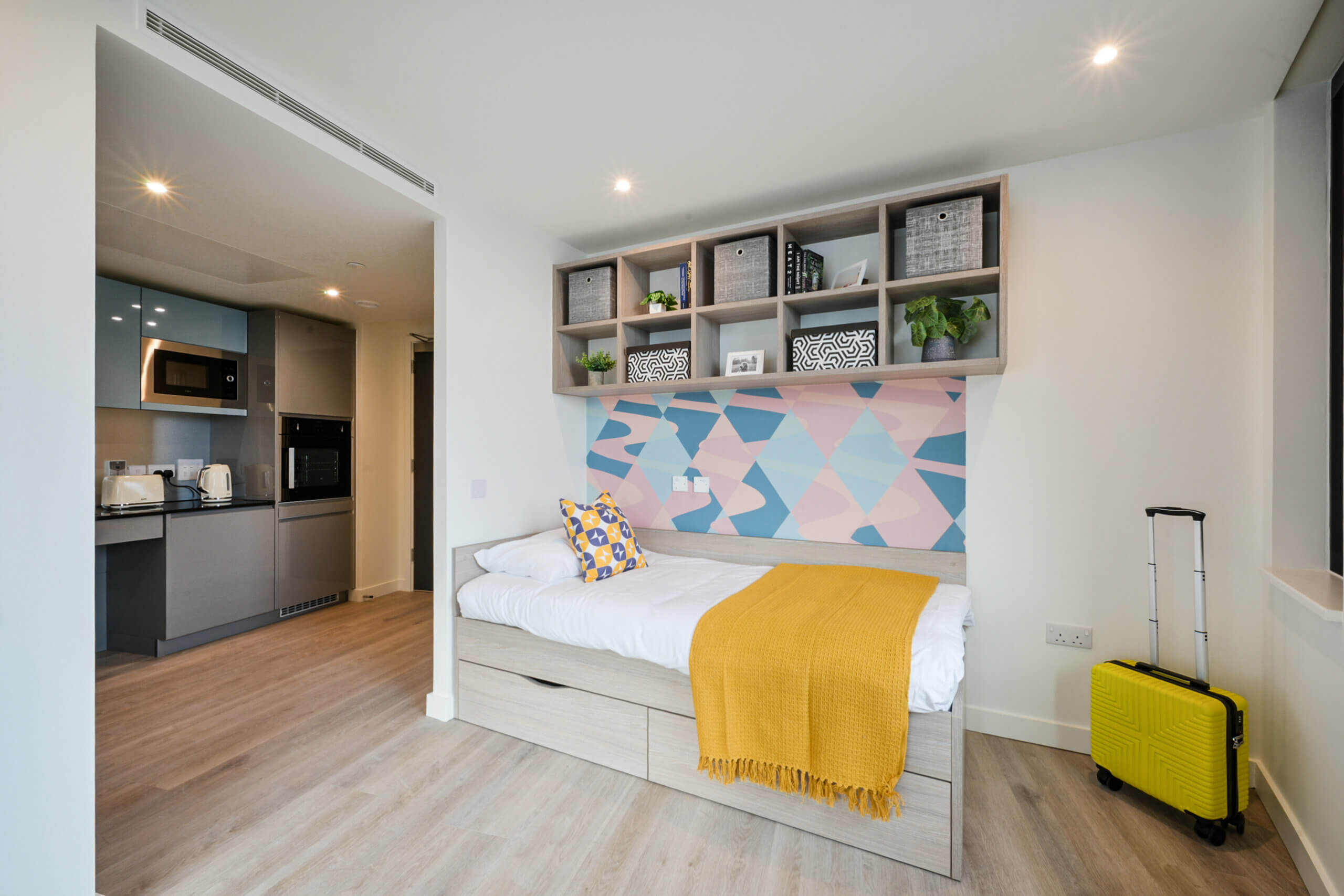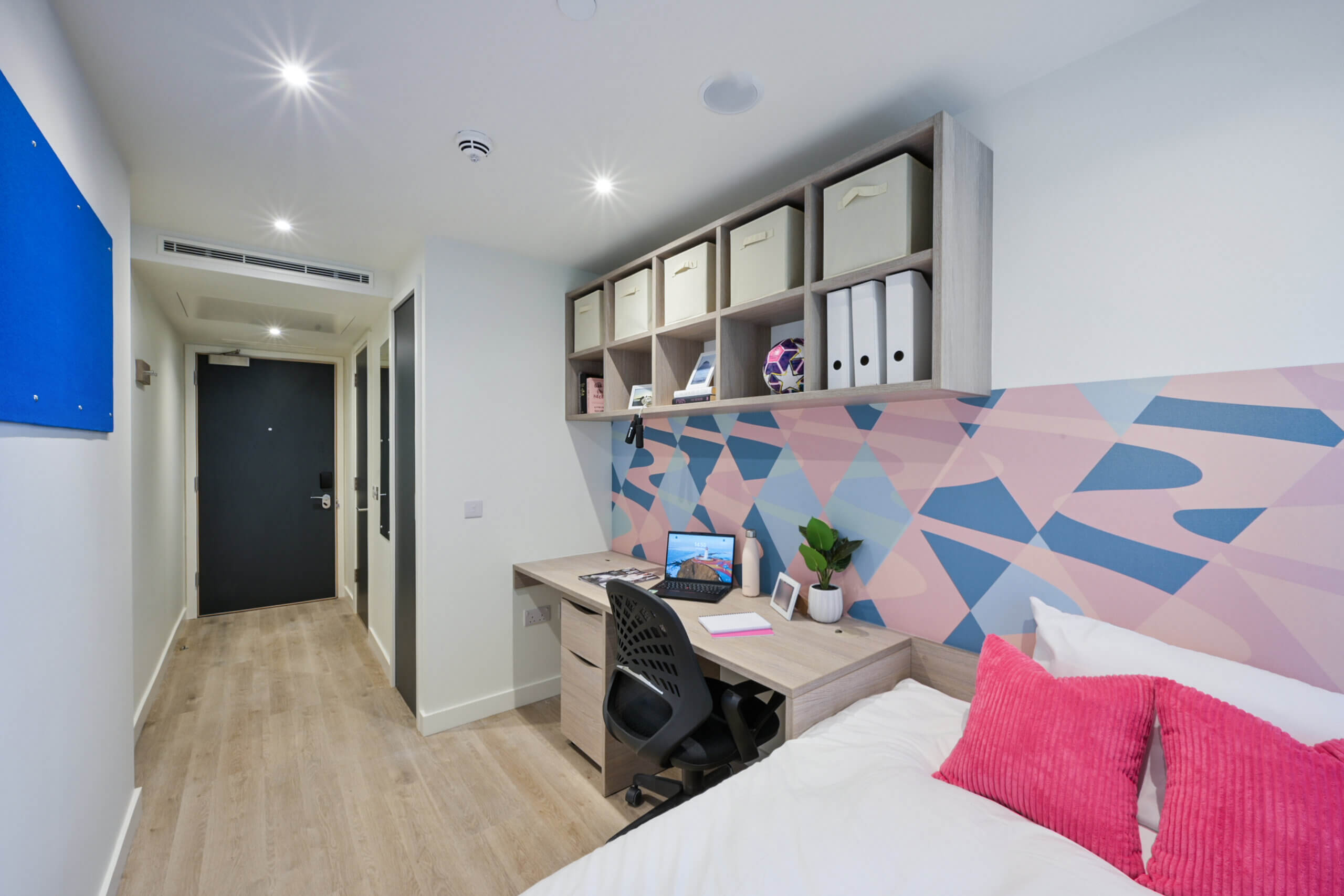 房间内部:有Ensuite与 Studio,前者共享厨房(最多 8 人),后者含独立厨房。均配床、书桌、衣柜等,床具为记忆棉床垫,有充足储物空间,带可调节冷暖系统、空气过滤及降噪设施,保障居住舒适。公寓设施:含 24/7 现场支持、电子钥匙门禁与 CCTV,保障安全。设健身房、洗衣房、公共休闲区、自习室及自行车存放处,提供 200Mbps 宽带,部分区域有微波炉烤箱一体机,满足学生生活学习需求。