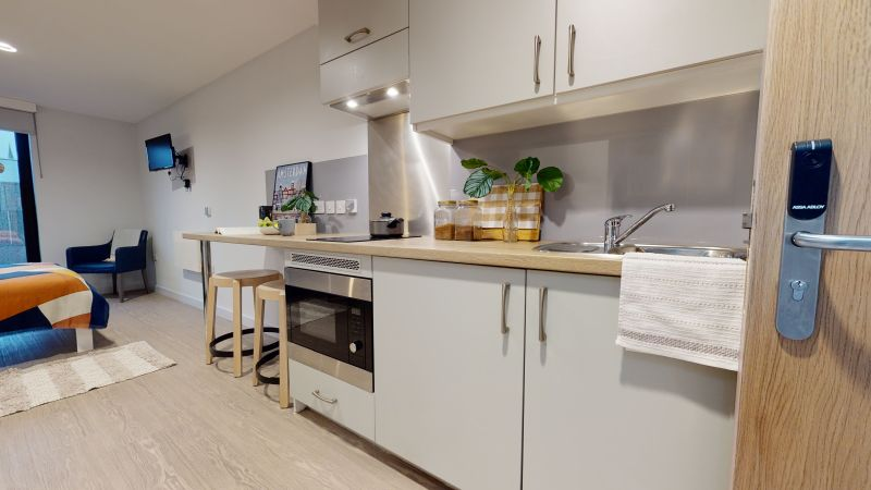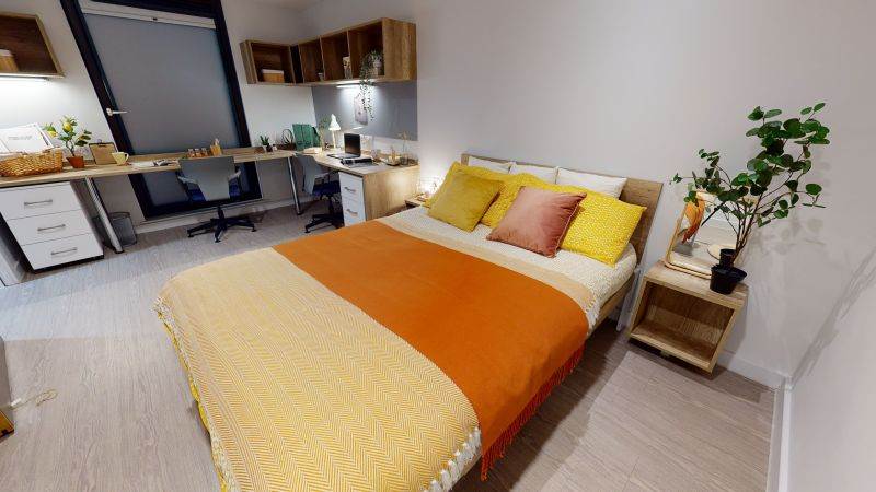 主力房型为 Ensuite与Studio,空间紧凑实用。配标准双人床、独立卫浴,有书桌、储物衣柜充足,暖气系统稳定,适配格拉斯哥湿冷气候。公共设施齐全,24 小时电子门禁 + 监控保障安全,共享厨房设备齐全,覆盖高速免费 WiFi,公共区域定期清洁,维修响应及时,生活琐事少操心。