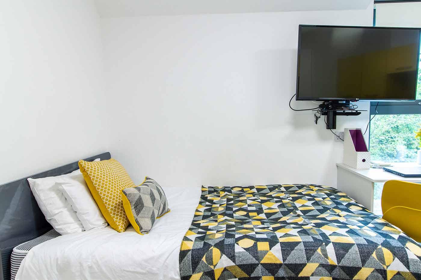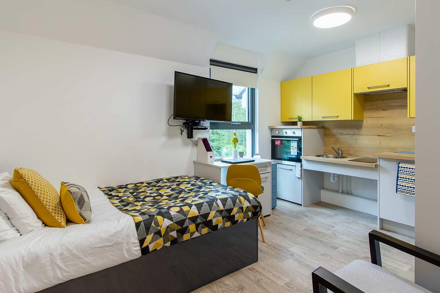 公寓提供2b Ensuite和Studio 房型。2b ensuite 房型独立卫浴、共用厨房,是喜欢社交的学生的最佳选择;Studio房型独立卫浴、独立厨房,为学生提供更私密和自在的个人空间。 房间配有双人床、书桌椅、衣柜、穿衣镜等,有充足的储物空间。厨房配有灶台、冰箱、烤箱等。
