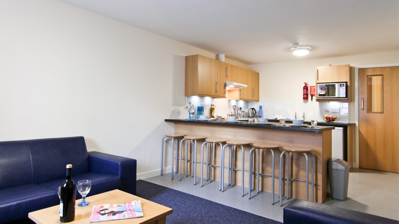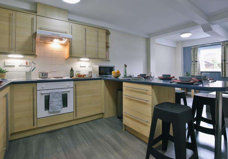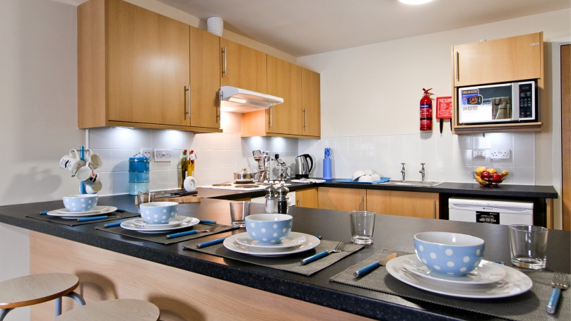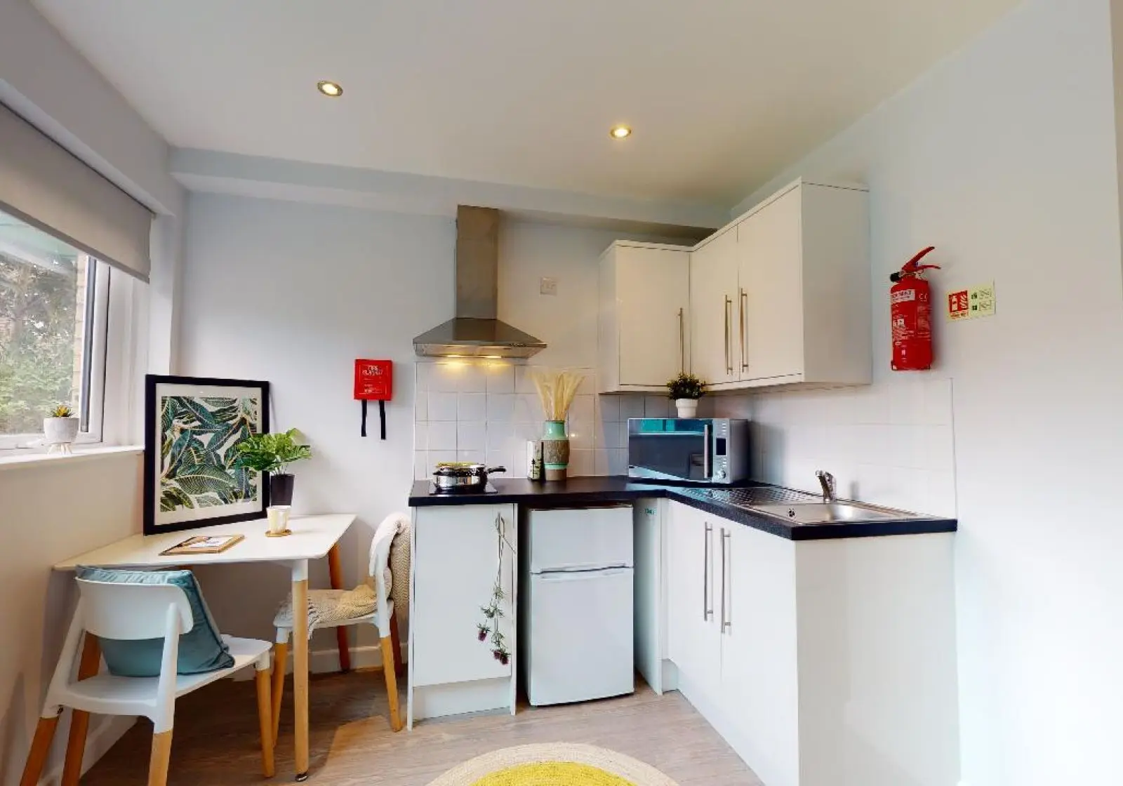 提供En-suite(4-5人共享厨房)与Studio两种房型,均配备舒适大床、书桌椅、衣柜及电视接口。共享厨房含烤箱、冰箱、微波炉等基础厨电,独立卫浴保障私密空间。