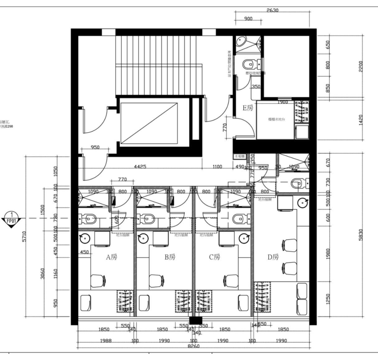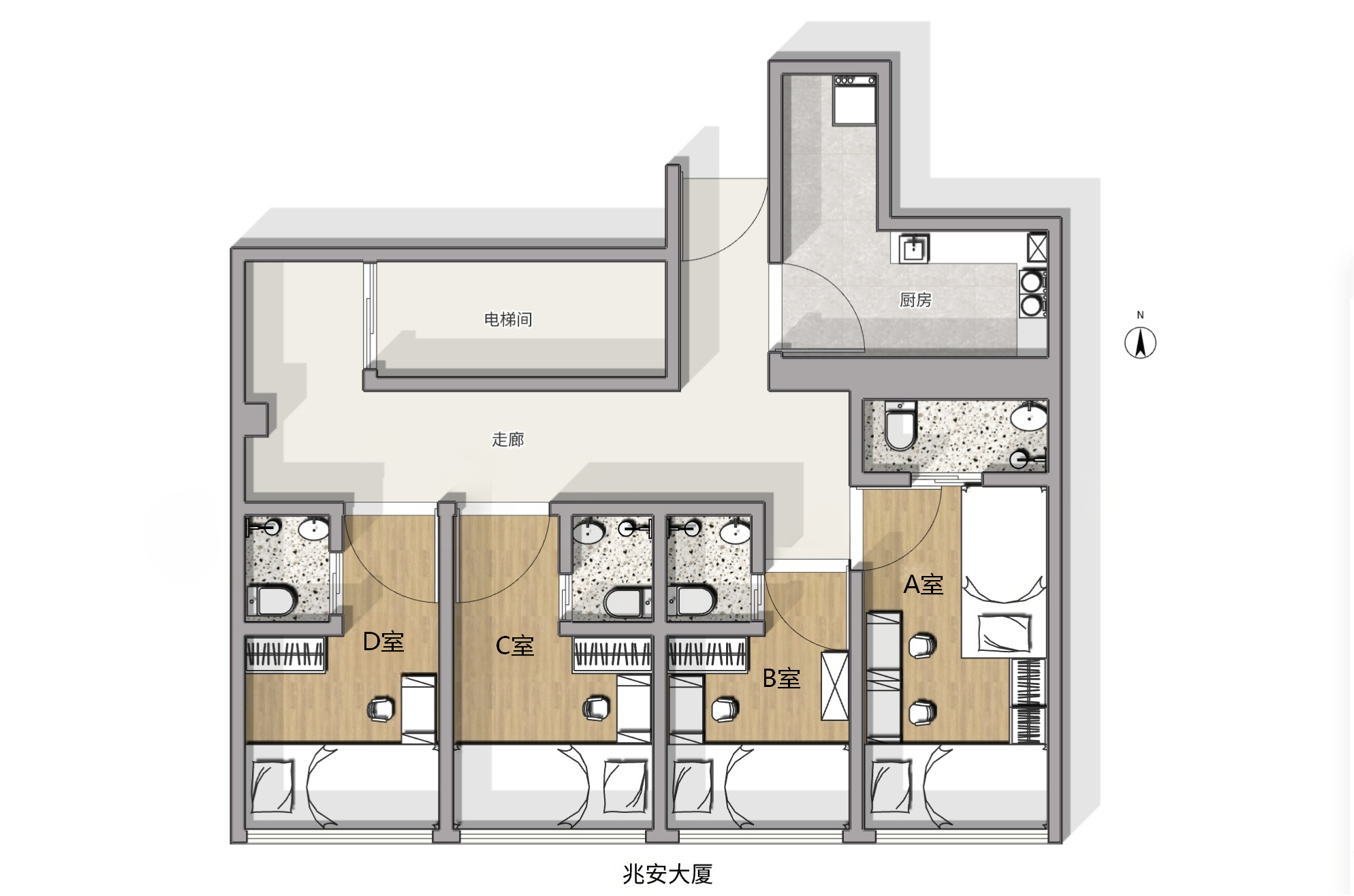 公寓设施:精装单位式 studio 布局,分设 A、B、C、D、E 不同房型,各房型均配备完善的家居与生活设施,且统一搭载三星电子门锁,保障居住安全。A-C 房配备单人床、床垫、窗式空调、桌椅设施、嵌入式衣柜,同时拥有冰箱、电灶、微波炉等厨电,以及前置式洗衣机、浴室电热水器、厨房抽油烟机、浴室排气扇等生活设备,搭配带轨道的罗马帘;D 房升级为大床房,桌椅设施为双份配置,其余设施与 A-C 房一致;E 房为嵌入式大床,搭配折叠桌椅,厨房配备排气扇,其余基础厨电、卫浴及软装设施齐全。公寓整体为一站式管理,提供免费 WI-FI、公寓设备保养、基本日常维修、定期公区清洁等服务,消防设备完善,满足学生独立居住的全方面需求。