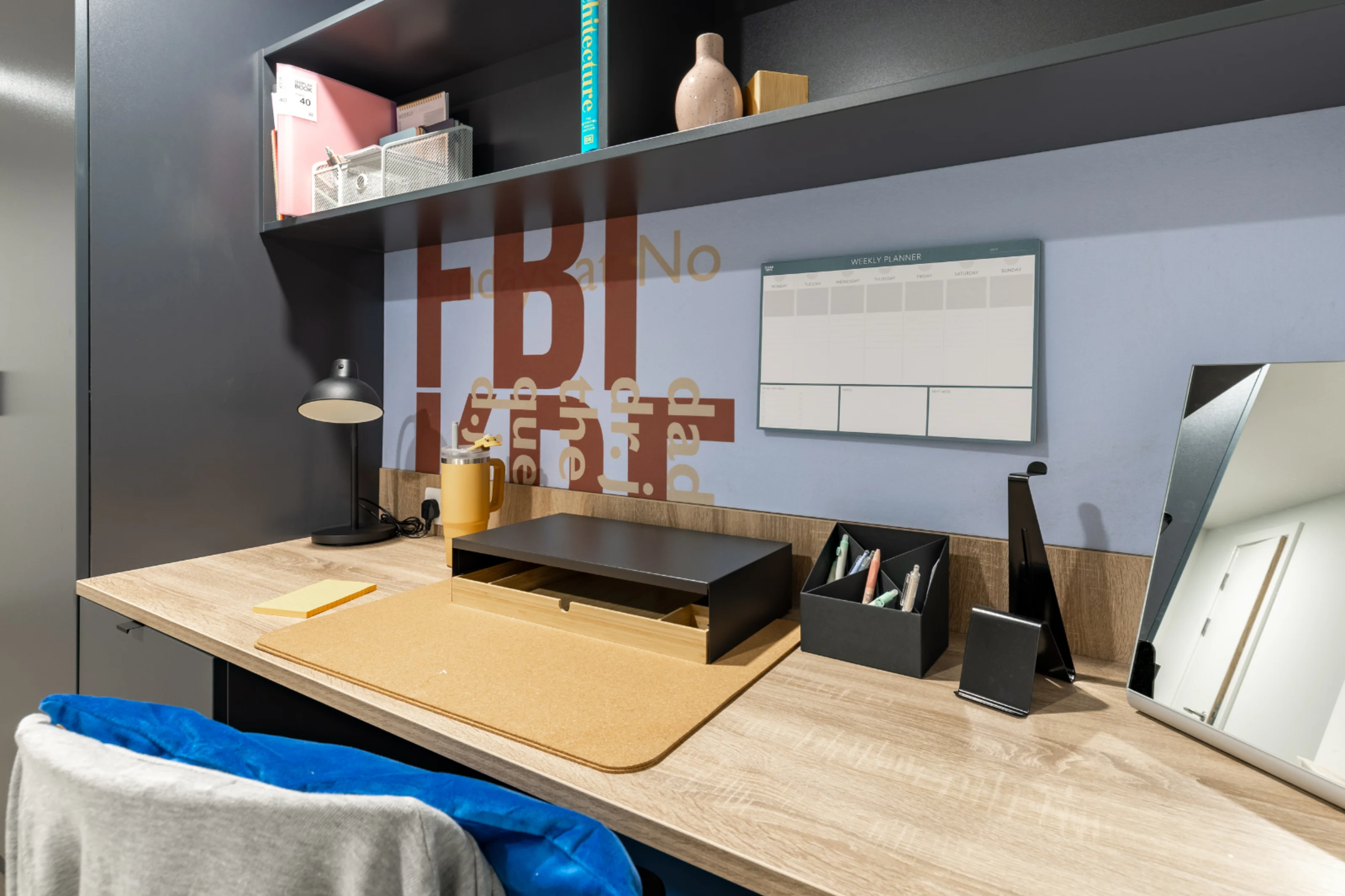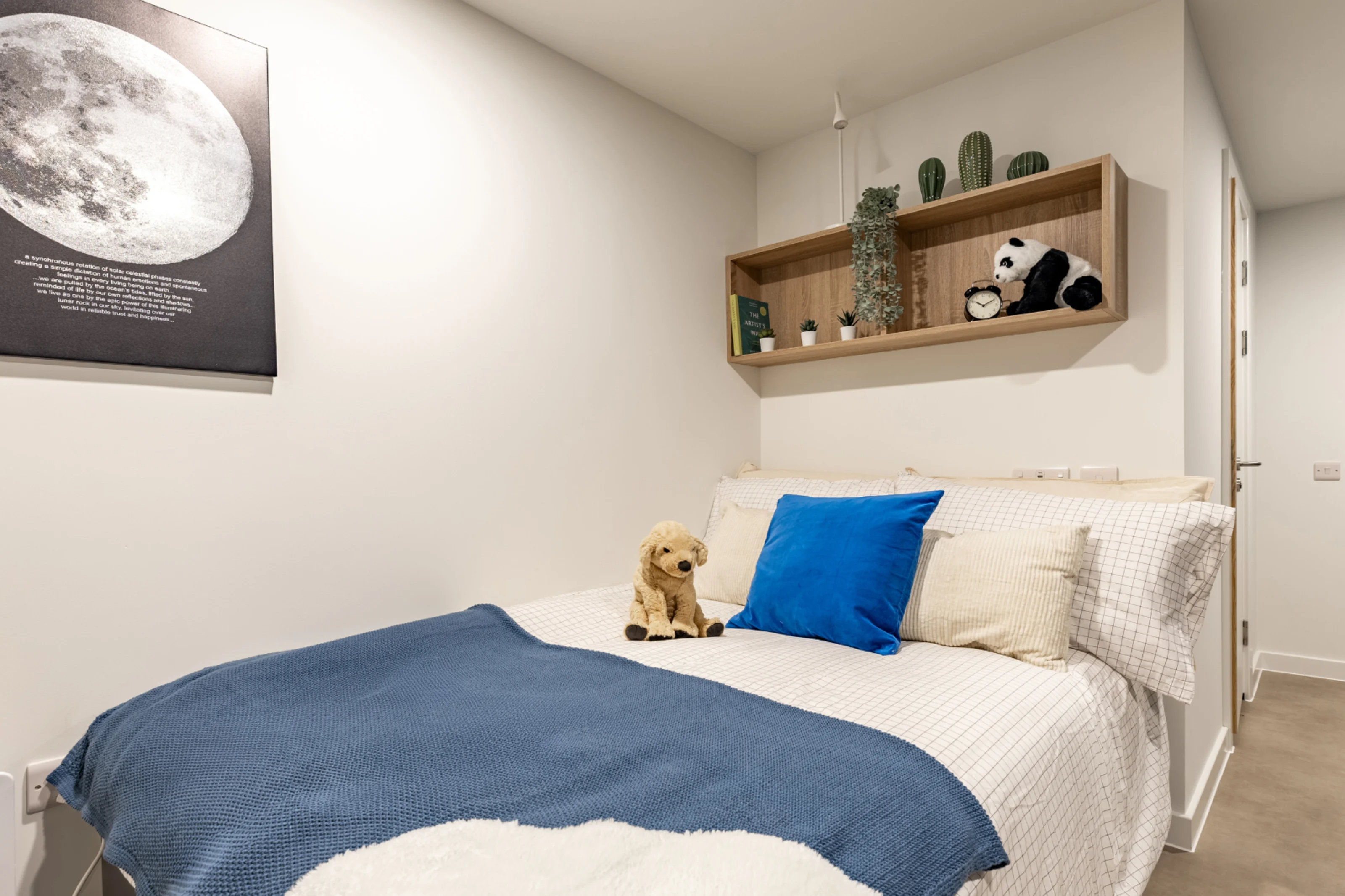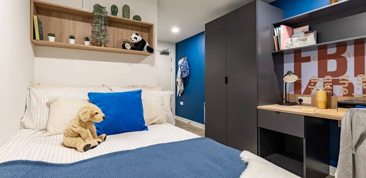 提供现代 Ensuite 套房与 Studio 房型,标配:双人床、智能收纳系统、独立学习空间