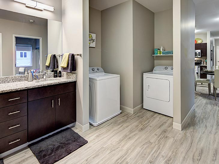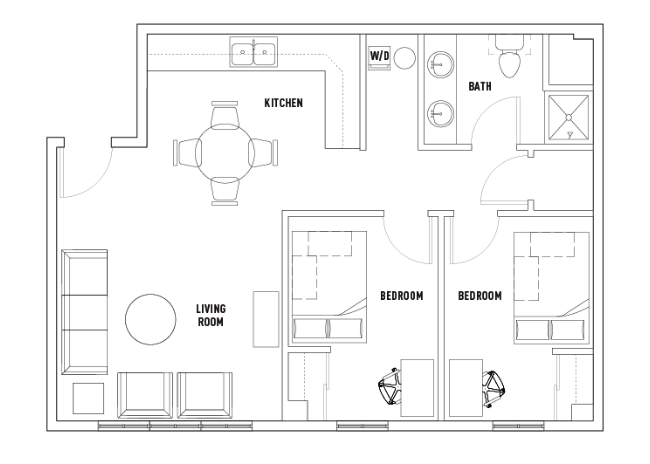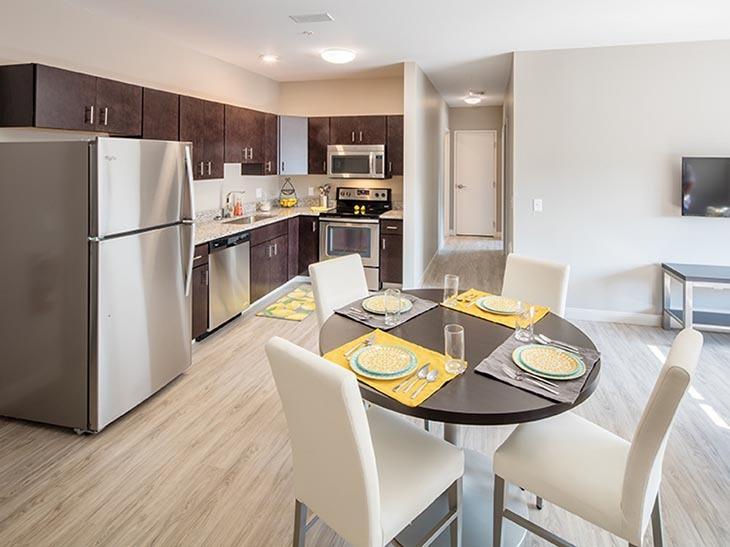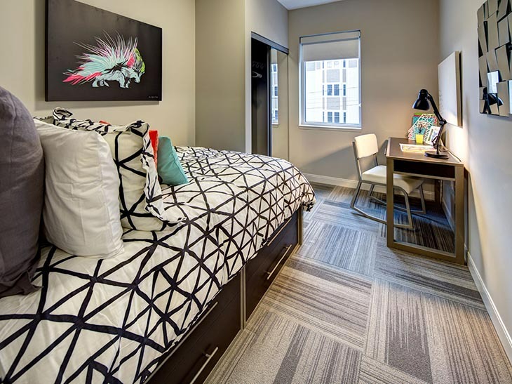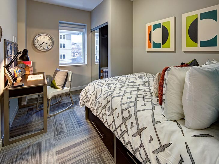 公寓设施:拥有 24 小时学术成功中心,内设小组研讨区与独立自习室,全公寓及社区公共区域覆盖高速 WiFi,每户均包含网络服务,部分户型采用高隐私设计,为学习创造安静环境。配备全套现代化厨房,含花岗岩台面与不锈钢家电,全屋采用仿实木地板,标配独立洗烘设备,社区设车库停车位,提供 24 小时随叫随到工作人员与专业的现场管理和维修服务,同时为封闭式社区,保障居住安全。设有 24 小时高端健身中心,配备力量训练器材、有氧器械与自由重量设备,24 小时休闲中心含台球桌等娱乐设施。工作人员均接受过心理健康支持培训,与 Hi, How Are You Project 合作推出心理健康相关项目,还定期举办教育、社交、娱乐类社区活动,全方位守护学生身心健康。