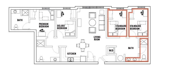 公寓概况:高端校外学生公寓,专为雪城大学学子打造适配校园生活的居住体验。公寓主打 2 居、3 居、4 居多种户型,户型设计兼顾社交互动与个人隐私,部分户型配备独立卧室与独立卫浴,满足单人居住或合租的不同需求。公寓采用个性化的居住方案,推出独立责任租约,租客仅需承担自身租金费用,无需为室友的租赁行为负责,是雪城大学学生校外居住的优选。
