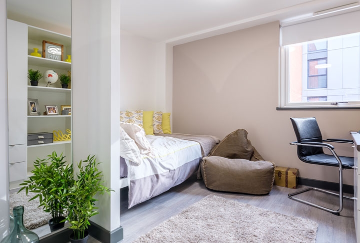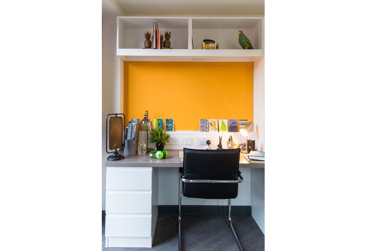 公寓提供 Ensuite和Stuio房型。ensuite 房型独立卫浴、共用厨房, 一般是5-8人间,是喜欢社交的学生的最佳选择;Studio房型独立卫浴、独立厨房,为学生提供更私密和自在的个人空间。公寓房间配有双人床、书桌椅、衣柜、穿衣镜等,有充足的储物空间。厨房配有灶台、冰箱、烤箱等。
