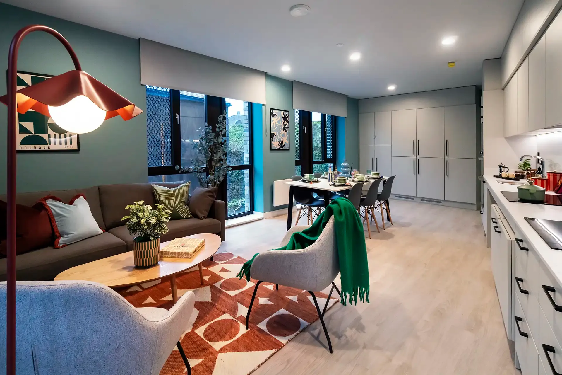 公寓配套丰富,包含固定费用账单、独立卫浴卧室、设备齐全的共享厨房、高速 WiFi、24 小时安全门禁与 CCTV 监控、现场维修团队、自行车存放区、私人健身房、影院室、学生社交空间、屋顶露台、现场洗衣房、定期社交活动、包裹代收服务,周边配套完善,紧邻咖啡馆与商店,建筑符合 NZEB 近零能耗标准,支持可持续居住。