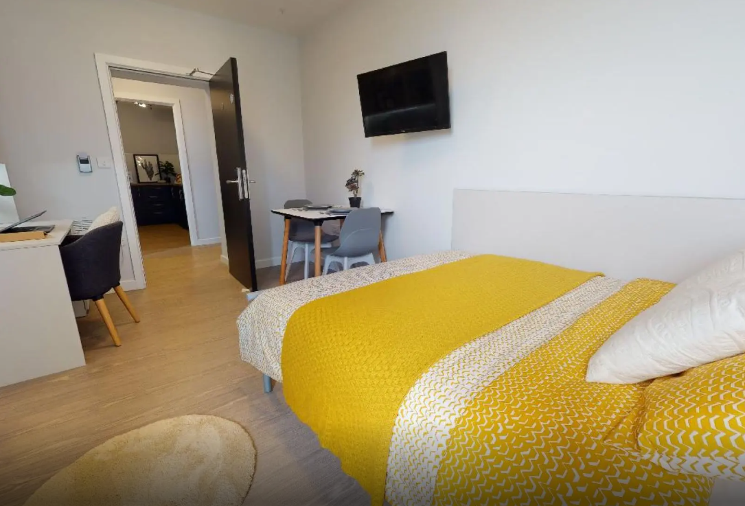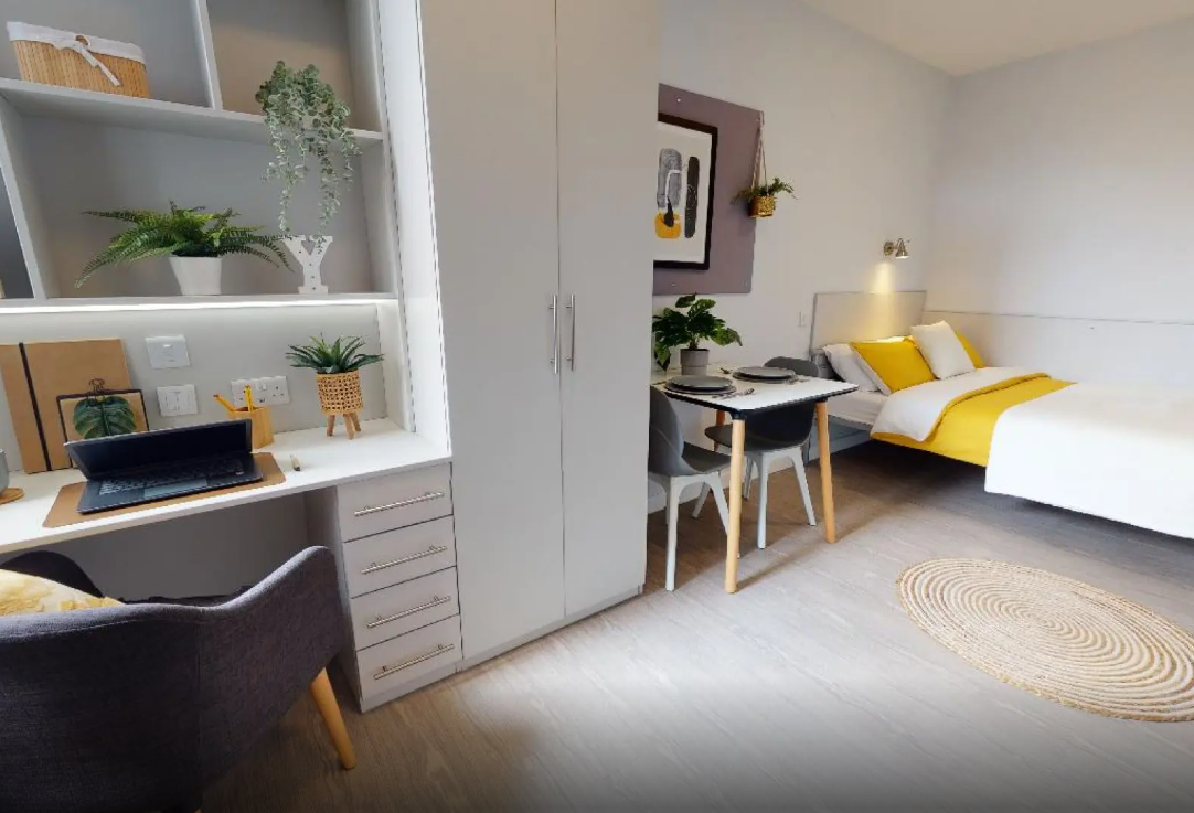 公寓提供多种房型,包括studio和ensuite。现代化的客房设施齐全,配备双人床、书桌椅、衣柜以及其他储物空间,满足日常所需。公寓还提供设备齐全的厨房,配备炉灶、微波炉、冰箱、水槽和食品柜。