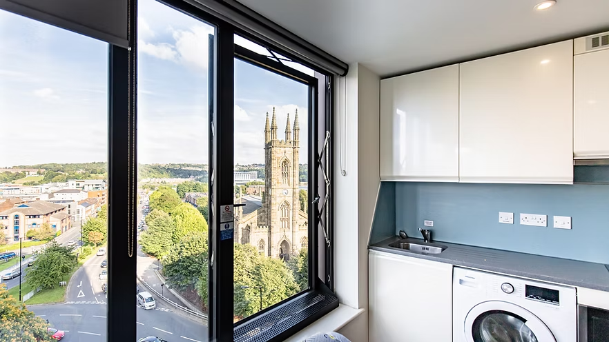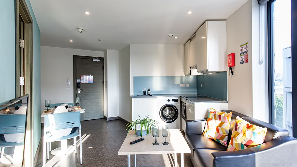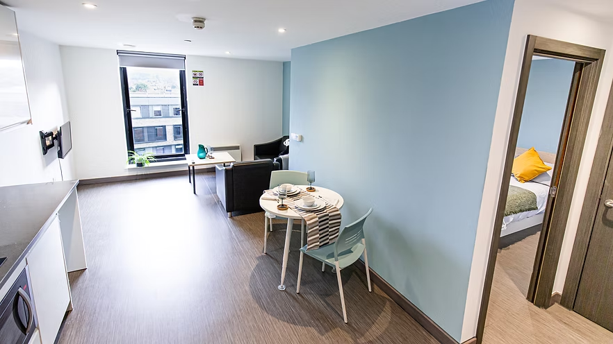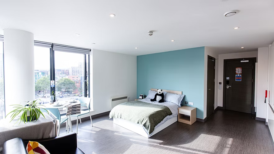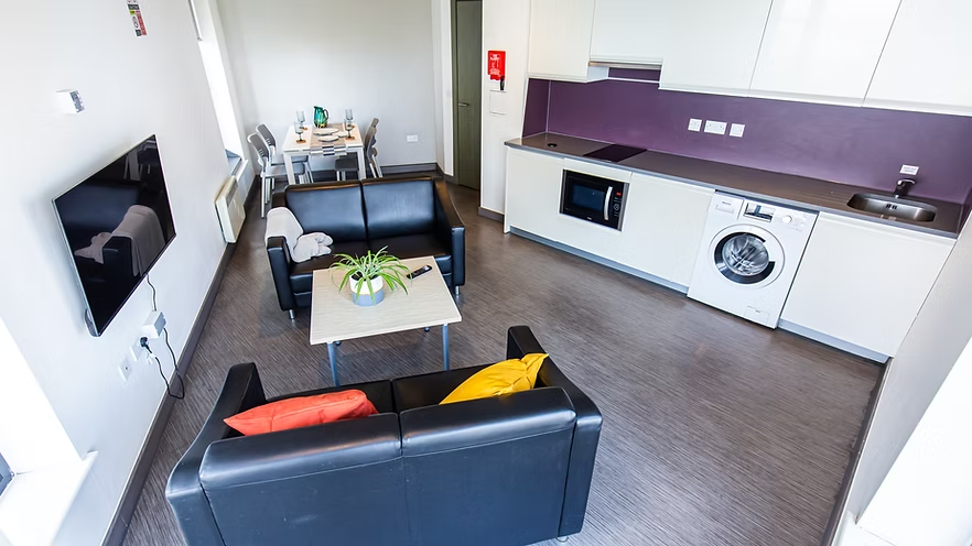 地理位置优越,紧邻市中心,提供免费的班车每小时一班,周边生活交通便利。公寓房型选择丰富,部分房型可双人入住,每周加20磅租金。