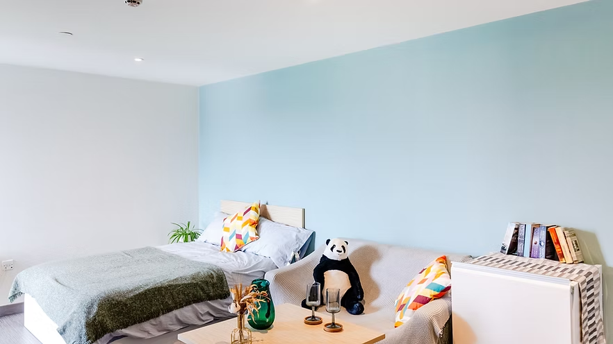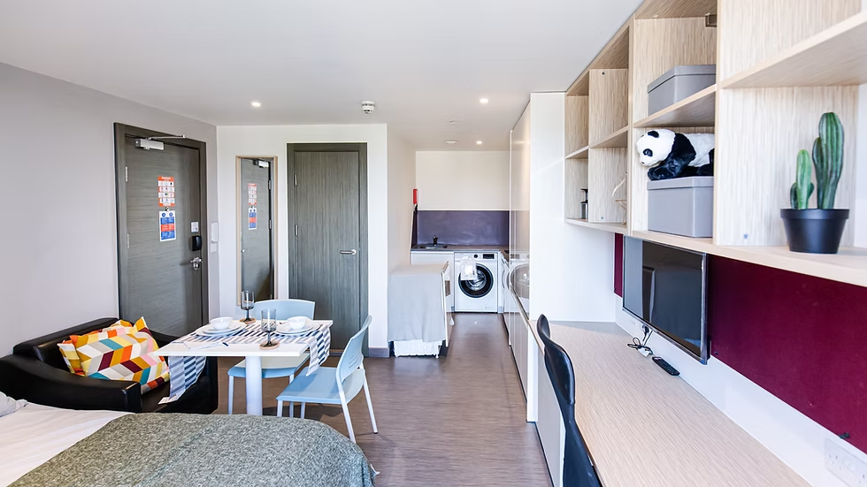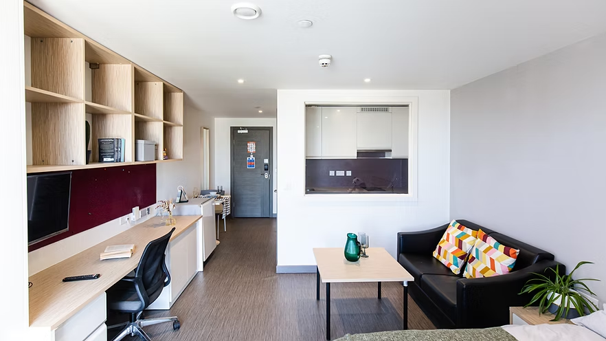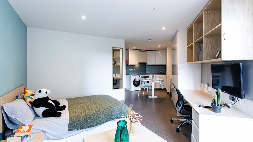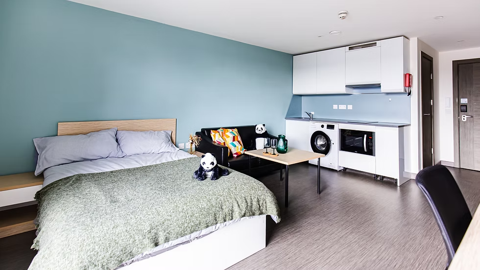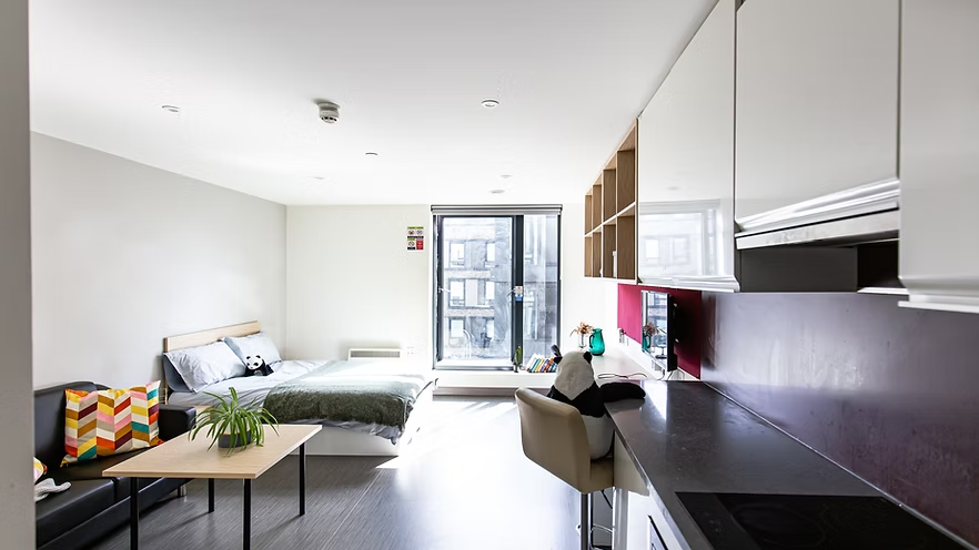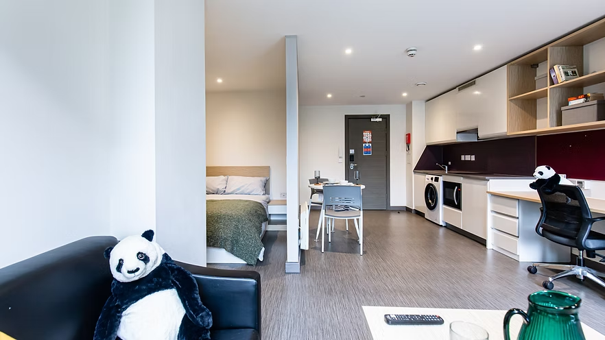 房间内部:各房型均配家具,Studio独立厨卫隐私性强,一/两居室空间宽敞。配备舒适床具、书桌及储物设施,厨房用品齐全,24小时热水与充足暖气,满足日常起居与学习需求。