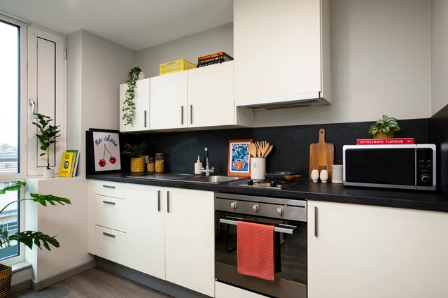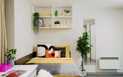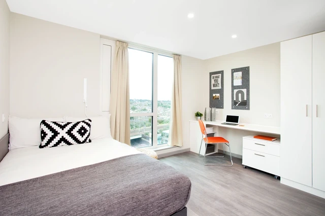 房间内部:En-suite(独立卫浴):4-9 人共用厨房,3/4 床(190cm×75cm),经典款 11㎡,高级款 11㎡(4-6 人共用),无障碍款 14-17㎡,均有学习区和储物空间