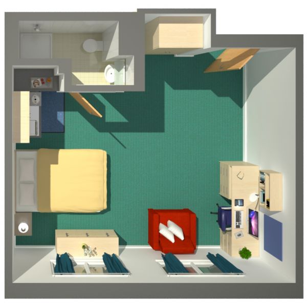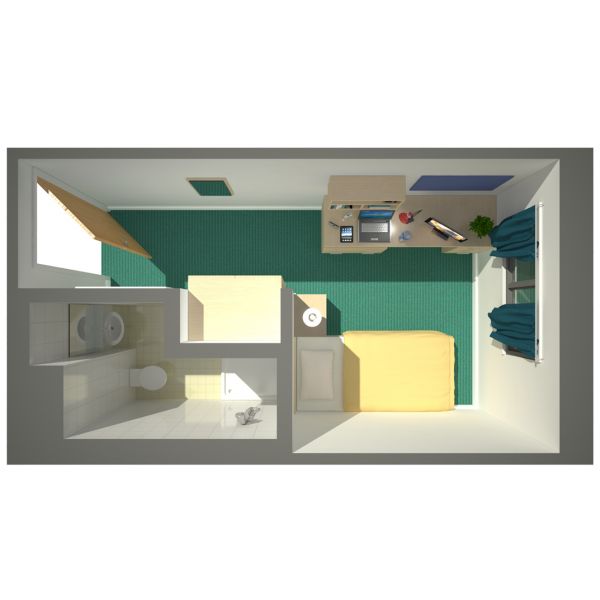 房间设计注重功能性,提供舒适的居住空间。室内配备全套家具、标准床型及独立卫浴。窗户可开启通风,配合独立的暖气与24小时热水,为您营造一个温暖私密的个人空间。