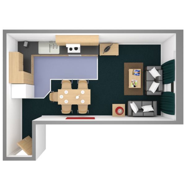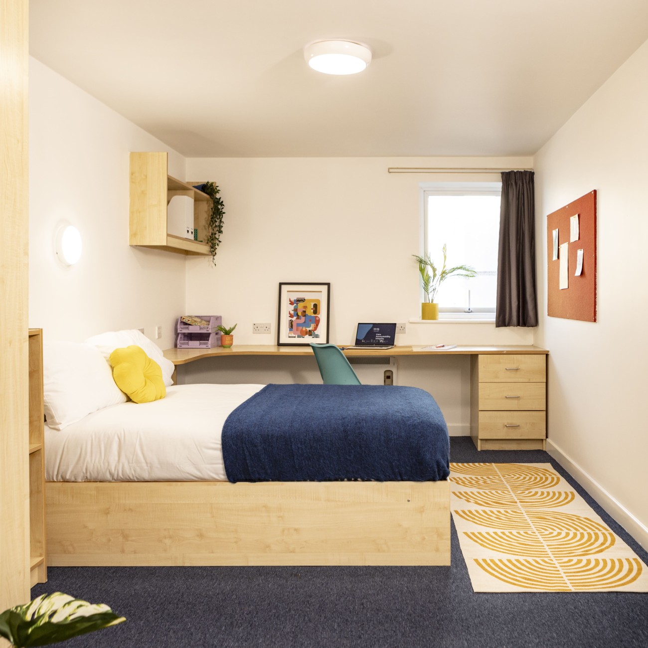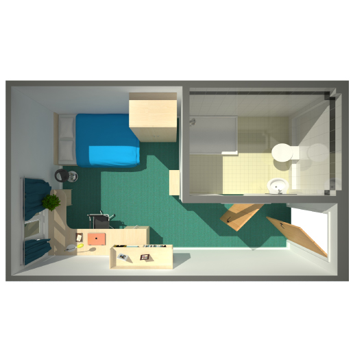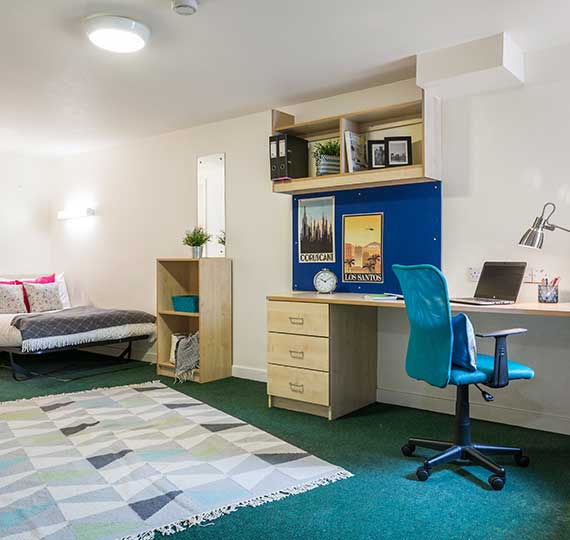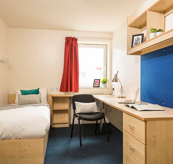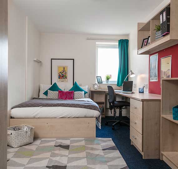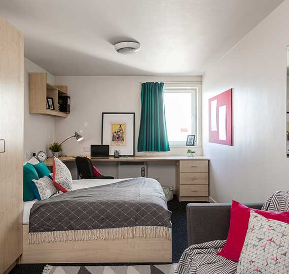 房间内部:主要提供En-suite房型。所有房间精美装修,家具齐全,配双人,带独卫,还有学习区,方便学生的生活和学习。