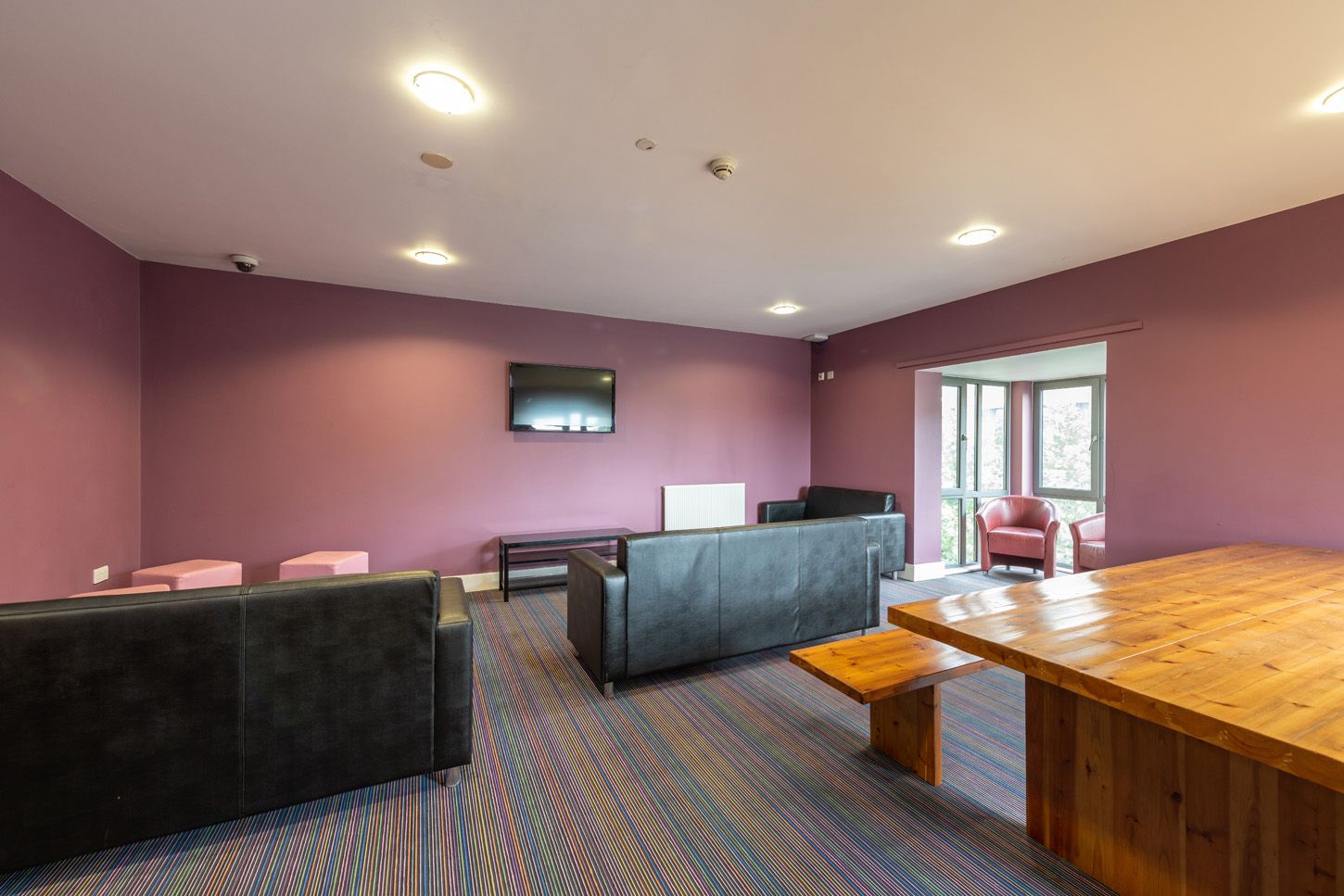 每层设自习室与电视房,一楼有公共学生中心和精美露台,更有电影放映室、洗衣房及自行车库,学习娱乐两不误。