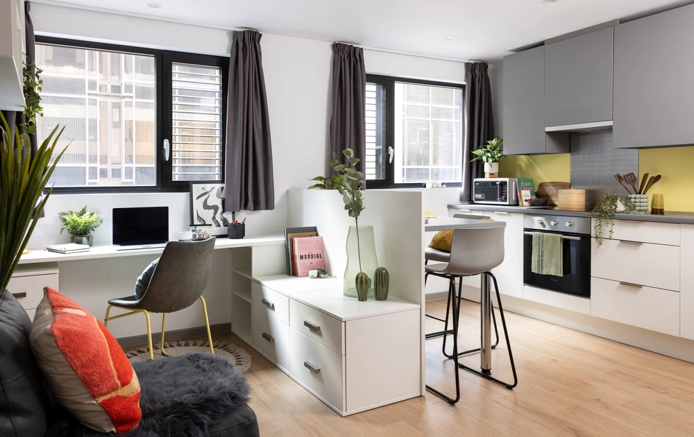 房间内部:En-suite(3-5人共享厨房)、Studio二种房型,带独立卫浴,窗户可正常开启,冬季有暖气,厨房含灶台、烤箱、冰箱,Studio及以上房型更享独立厨房,自在烹饪不打扰。
