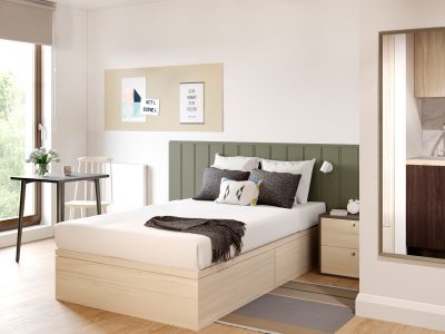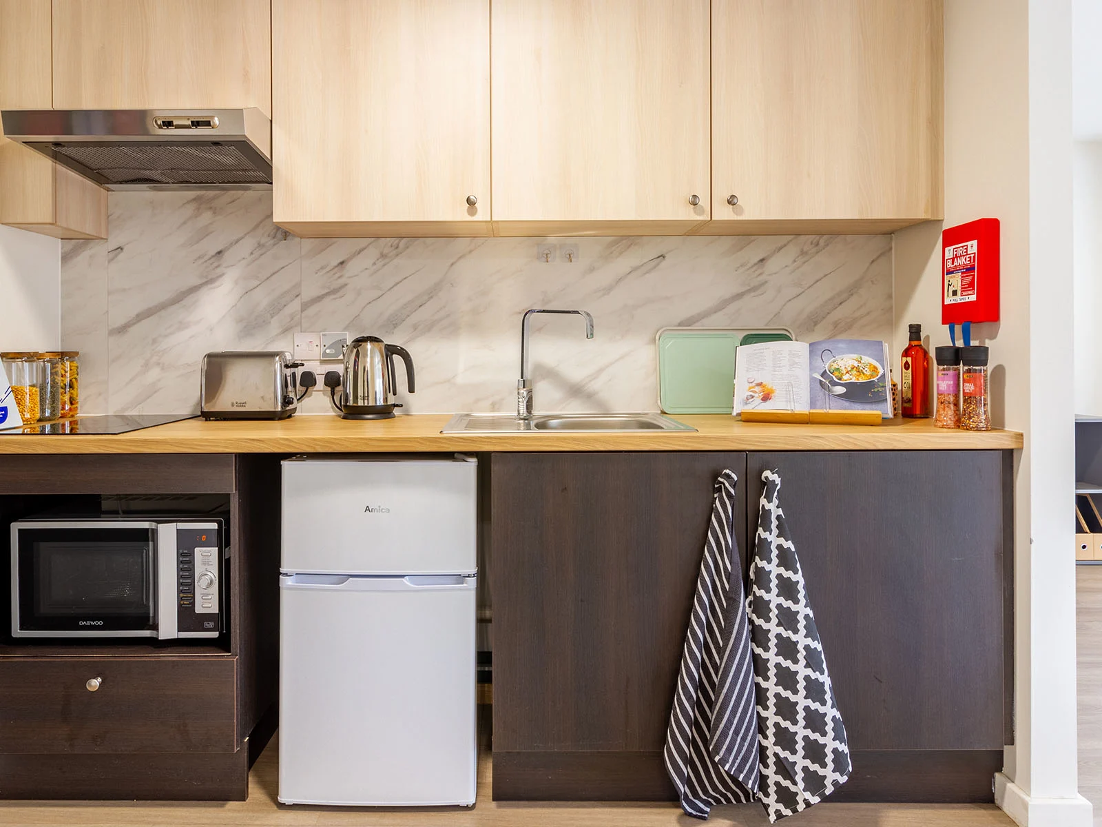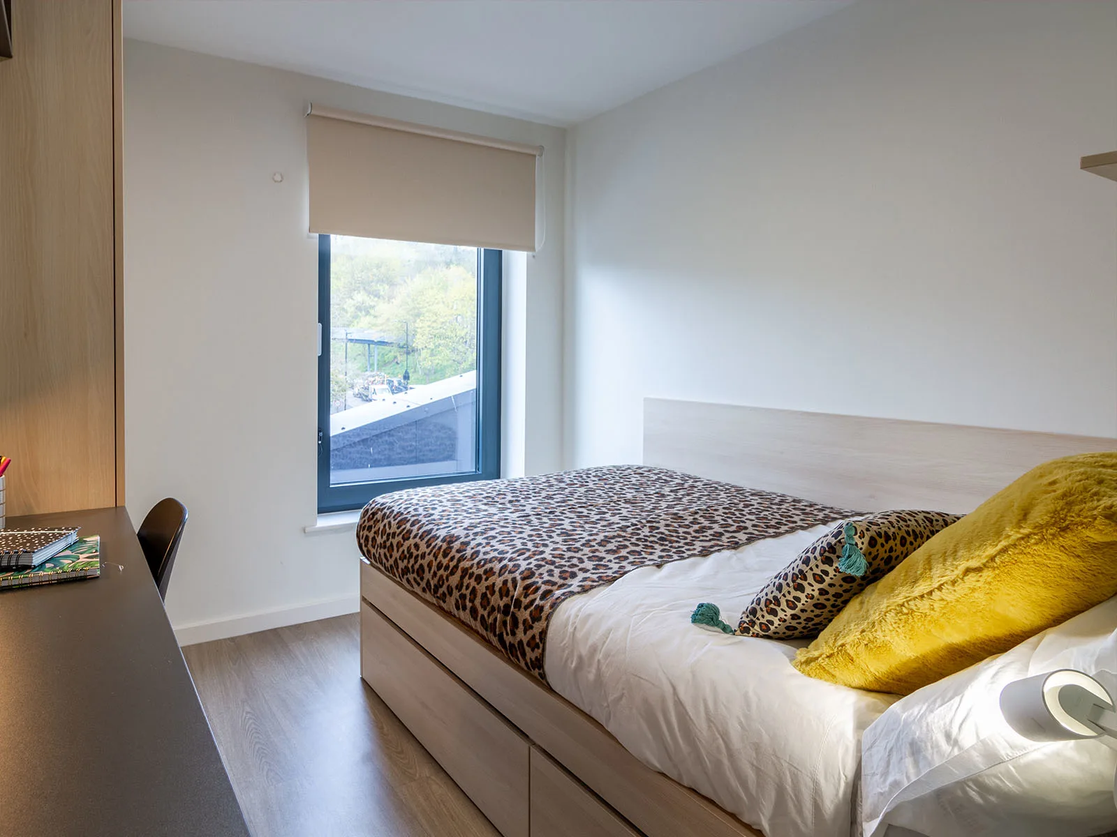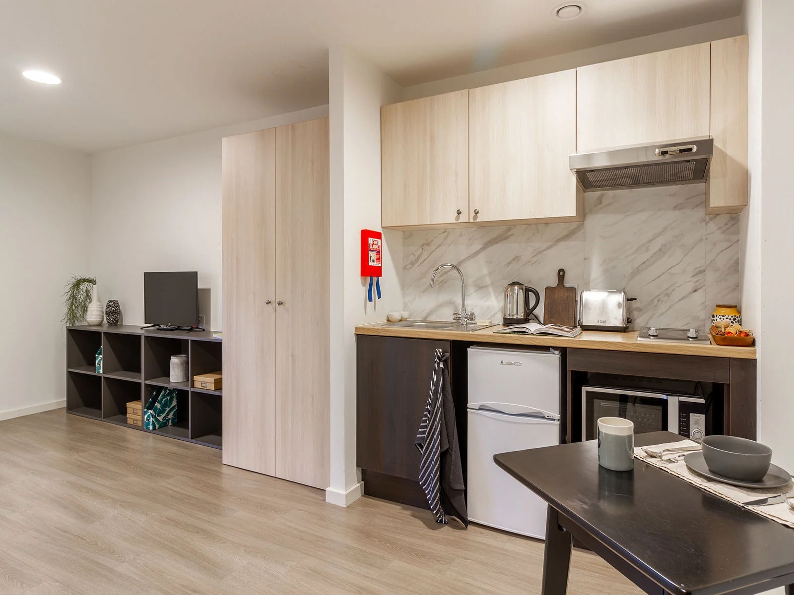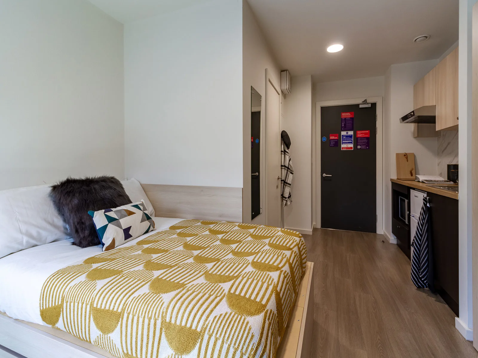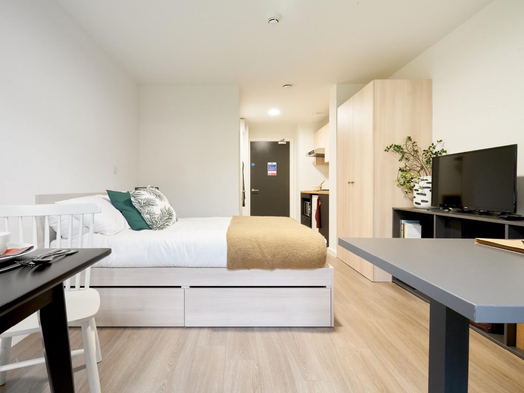 公寓提供 Ensuite和Stuio房型。ensuite 房型独立卫浴、共用厨房, 一般是4-6人间,是喜欢社交的学生的最佳选择;Studio房型独立卫浴、独立厨房,为学生提供更私密和自在的个人空间。公寓房间都是大落地窗,视野采光都很好。特别是部分河景房。房间配有双人床、书桌椅、衣柜、穿衣镜等,有充足的储物空间。厨房配有灶台、冰箱、烤箱等。
