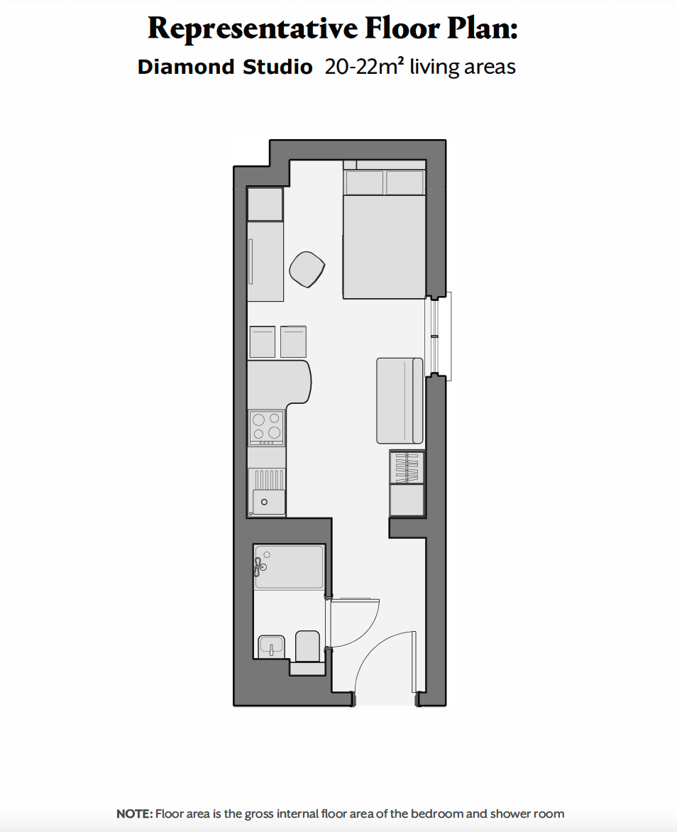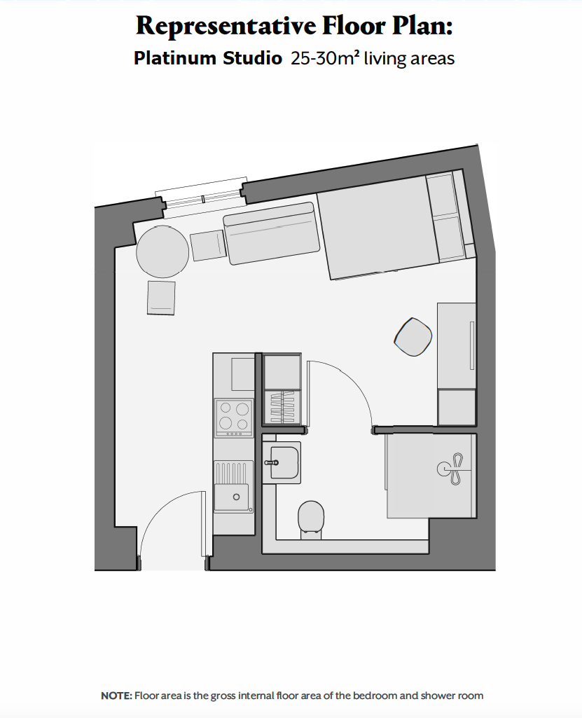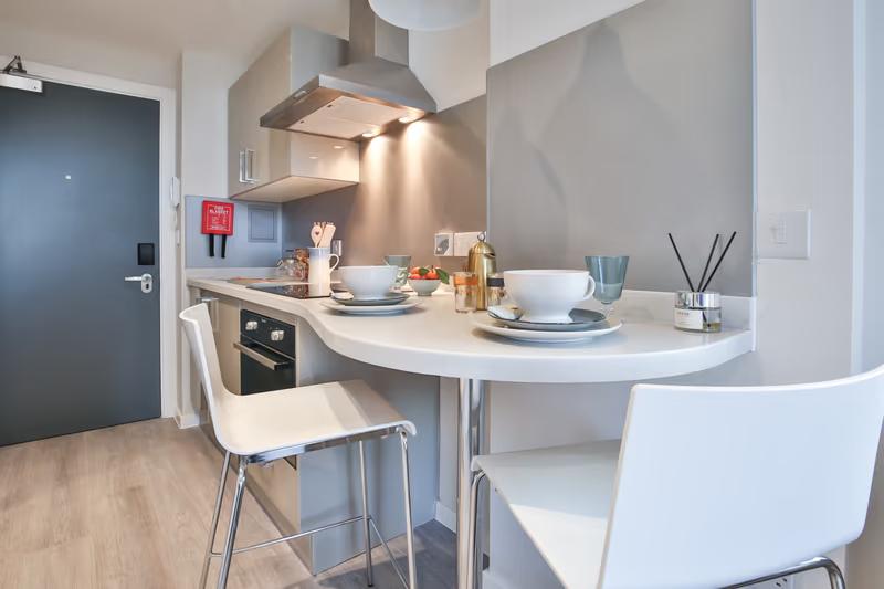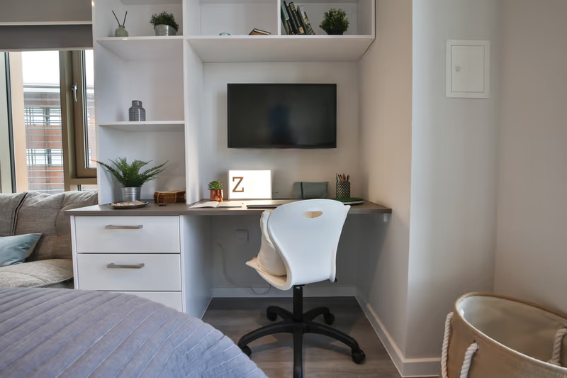 房间风格以浅色木纹、复古砖墙和大面积采光为主,整体简约明亮。提供studio(独立厨房)和3–4人cluster(独立卧室共用厨房客厅)。房间配备¾大床、学习桌椅、储物柜、独立卫浴(部分房型),大窗户采光很好。厨房配套包括烤箱、炉灶、冰箱、微波炉等。公共区域有学习室、会议空间、自习区,适合复习写论文;也有游戏室、休闲区和健身房满足社交和运动需求。公寓拥有24小时门禁、CCTV、物业与维修团队常驻,另设洗衣房、电梯、自行车储存,账单全包省心。