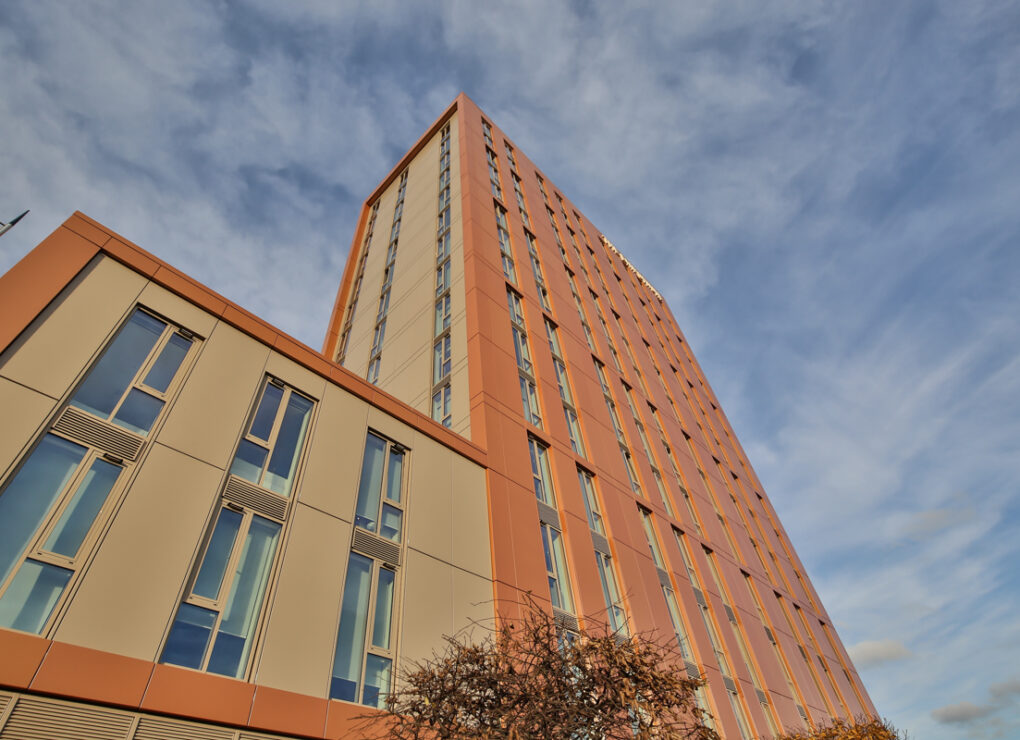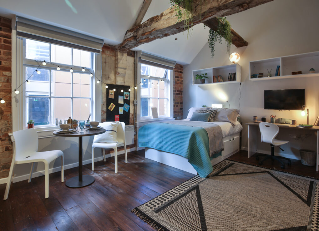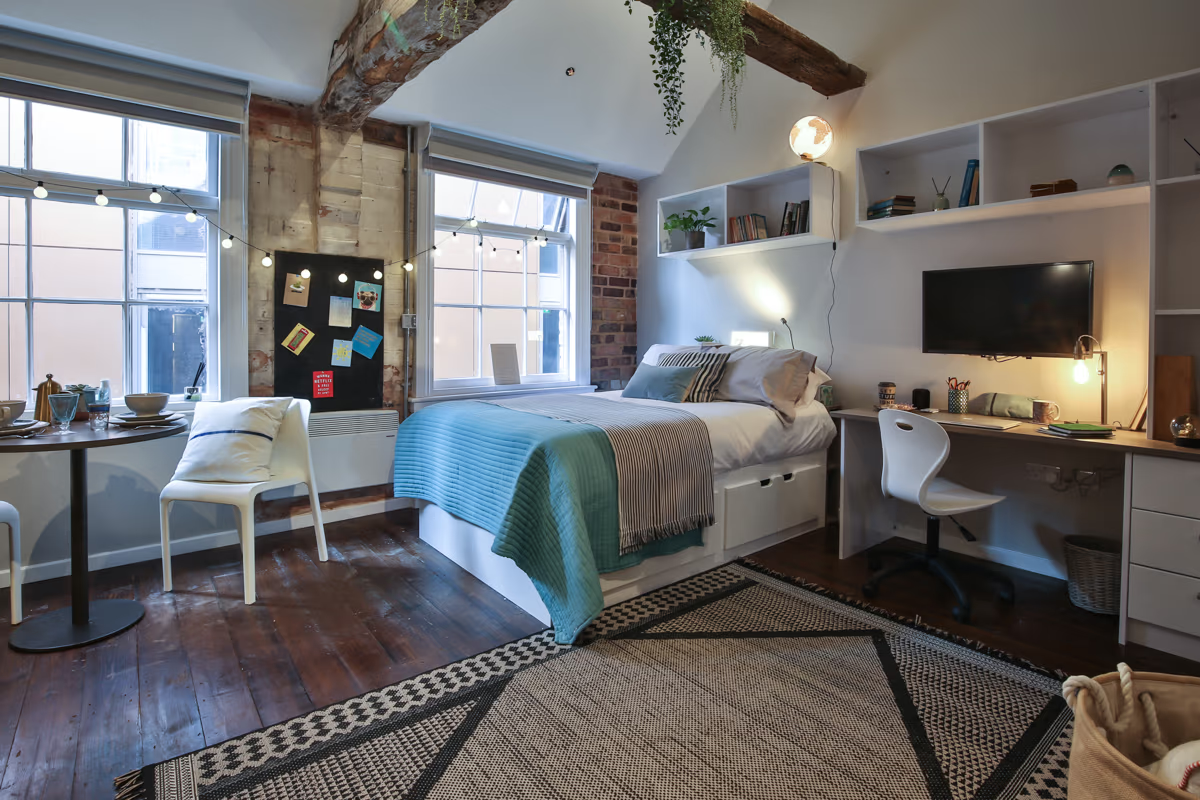 公寓位于伯明翰市中心Eastside区域,紧邻大学区和新开发的学习生活圈,是适合本科与研究生的现代化学生公寓,整栋楼保留复古砖墙与大窗设计,整体空间明亮、宽敞、有生活质感。