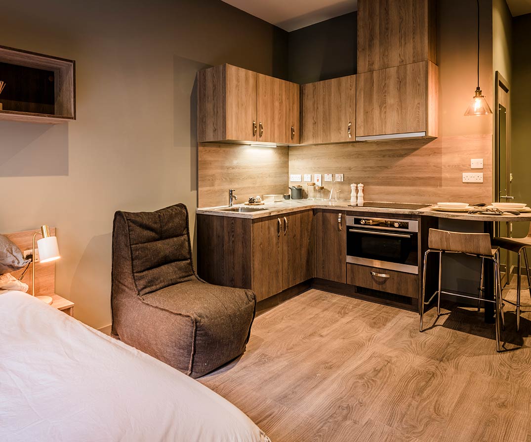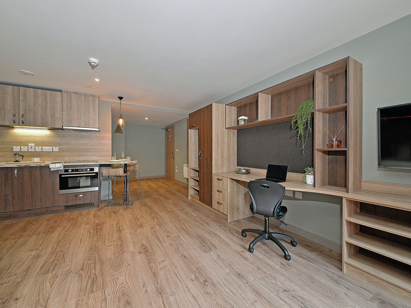 所有房间都是studio房型,有独立卫浴和厨房,配备一台32英寸平板电视,方便学生在课余时间观看电影放松身心。有安静的自习室专心学习,也可以在舒适的住户俱乐部休息室与朋友小聚。此外,公寓还提供洗衣设施和安全的自行车存放处,供学生随时使用。