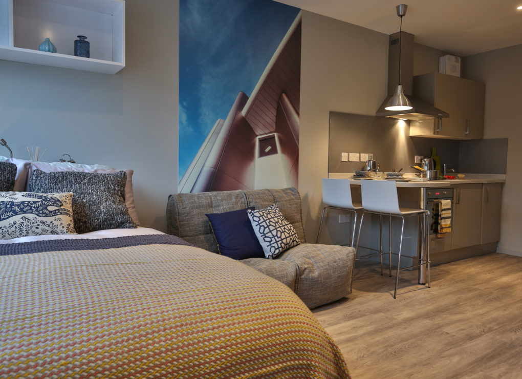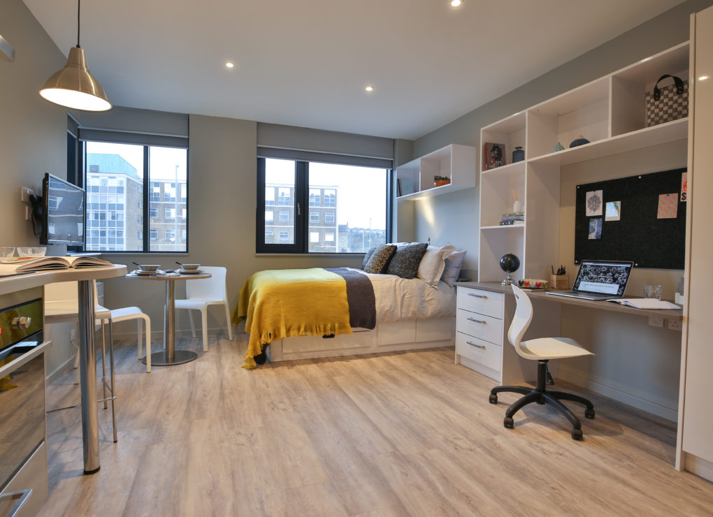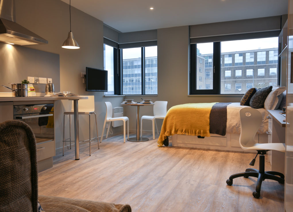 哈德斯菲尔德市中心核心地段,步行3分钟直达大学,全Studio房型,租金包水电网暖,厨房起居学习区齐全。