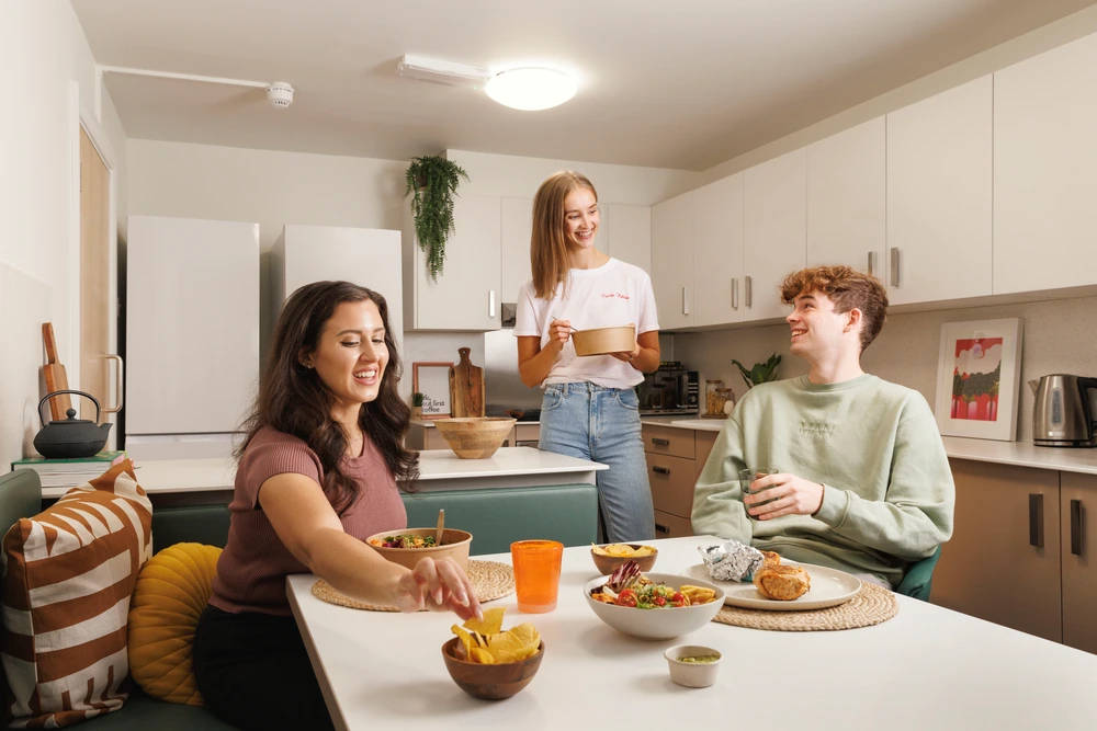 这里主打非独立卫浴的共享套间,13㎡的面积不算拥挤,Double bed睡起来也足够舒服,24 小时安保巡逻、监控摄像头和门禁系统,晚上晚归也不用怕,还有 24 小时待命的维修团队,灯泡坏了、水管堵了随时能报修。公共区域是大家的 “社交 + 学习宝地”,安静的自习区能满足赶 due 需求,再也不用去图书馆抢位置; communal 厨房设备齐全,和室友一起做饭分享美食超有生活感。除此之外,洗衣房、自行车库、前台接待等基础设施也一应俱全,日常需求都能在公寓内解决。