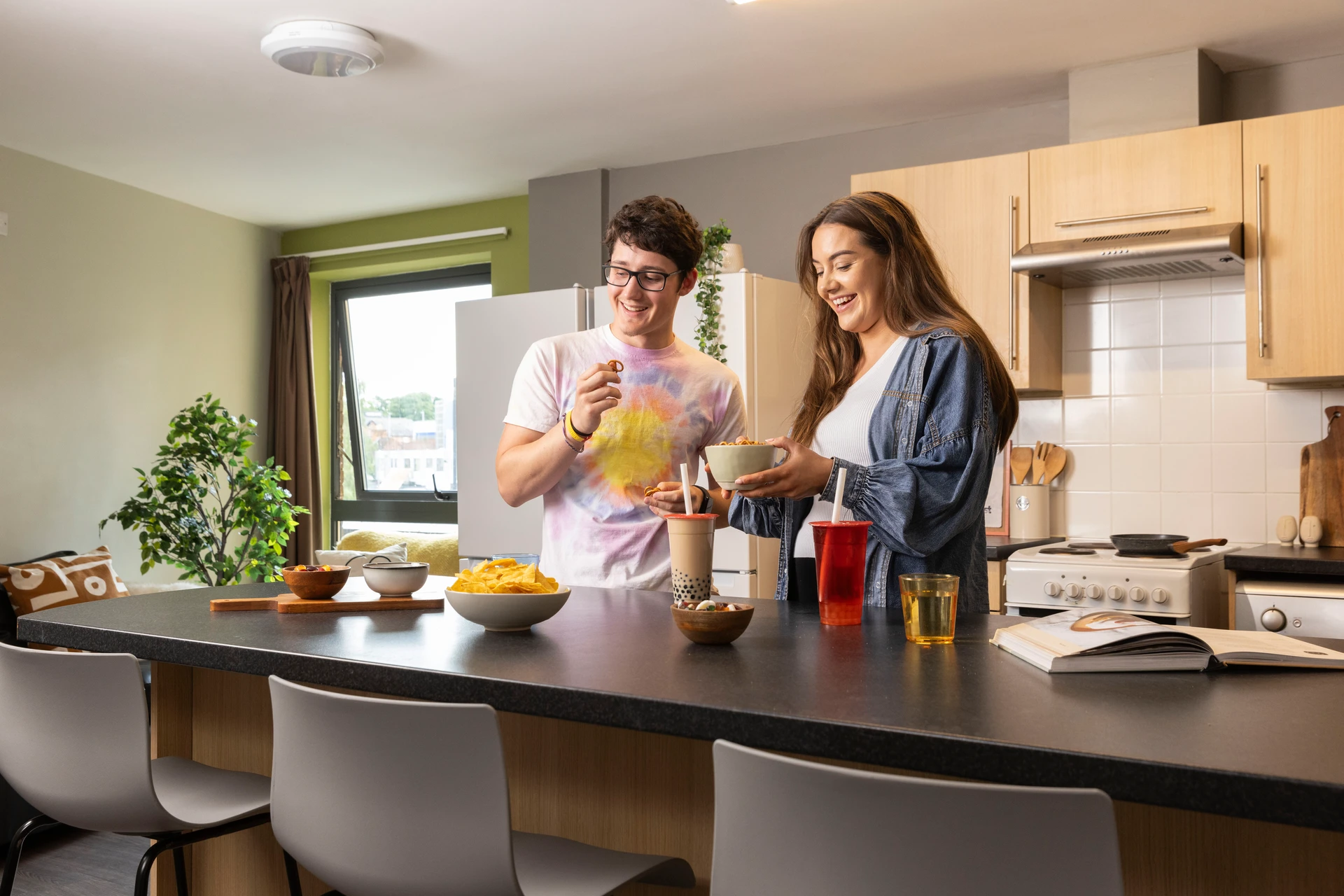 公寓设施:24 小时监控和现场安保岗都有,晚归刷门禁时很有安全感;公共厨房的烤箱、微波炉、冰箱都是基础配置,和室友分工做饭互不打扰;洗衣房是投币式的,随时能洗换季衣物;自习室空间不大但桌椅充足,赶 due 时不用去图书馆抢位置;偶尔会组织披萨派对之类的社交活动,社恐也能轻松融入。