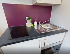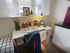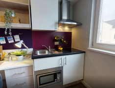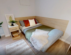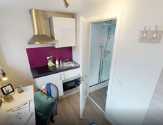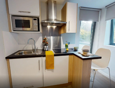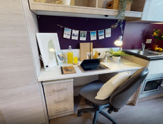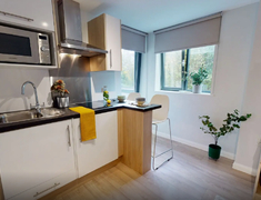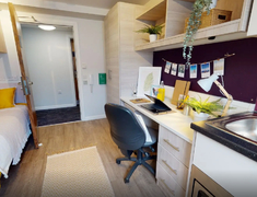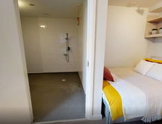 房间以En-suite和Studio,每个房间配独立卫浴、单人床、书桌 + 书架、衣柜,书桌带多口充电插座,衣柜能塞下四季衣服,厨房配有冰箱、微波炉、吸尘器等基本厨房设备。