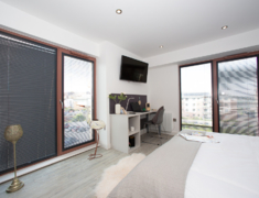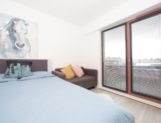 高配Studio,配备双人床、书桌、沙发区及独立厨房,装修现代,配备智能电视、高速WiFi。