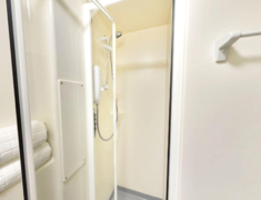 16.浴室内有淋浴设备,洗手池,镜子,坐便器,毛巾架等