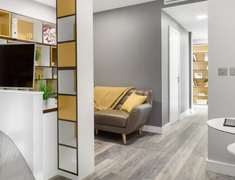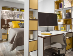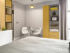 Grande Studio:面积 34㎡,升级为 kingsize 床、40 英寸智能电视、 rainfall 淋浴系统,厨房配备洗碗机与独立餐厅,适合追求品质居住的学生。