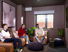 安静的 communal study space 适配自习、小组讨论,平时约上同学一起复习、讨论课题,或是独自沉浸式赶 due,都能找到合适的角落一楼休息室有沙发、电视和桌上足球可休闲互动,公共洗衣房配备多台洗衣机与烘干机,自行车存放处凭卡出入更放心。安全保障拉满,24 小时安保巡逻、全楼 CCTV 监控、电子门禁系统加持,还有即时响应的维护团队,深夜返程或设施故障都能安心,让父母放心。