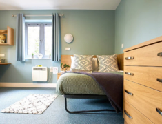 公寓提供3种 Ensuite房型。ensuite 房型独立卫浴、共用厨房, 一般是5人间,是喜欢社交的学生的最佳选择。每个flat公共厨房都有独立的洗衣机,使用方便卫生,房间配有双人床、书桌椅、衣柜、穿衣镜等,有充足的储物空间。厨房配有灶台、冰箱、微波炉、烤箱等。公寓设施比较齐全,公寓有学习室、公共休息室、庭院、游戏室、洗衣房等,公寓定期会举办活动,满足同学们学习、休闲、社交的需求;有前台、24小时监控、安保和门禁系统,安全感满满。