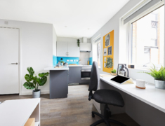 房型分为ensuite和studio两种,ensuite为4-6人间,多种租期可供选择。房间配置书桌椅和储物空间,studio房间还有个人冰箱和私人厨房区,满足不同租客的需求。